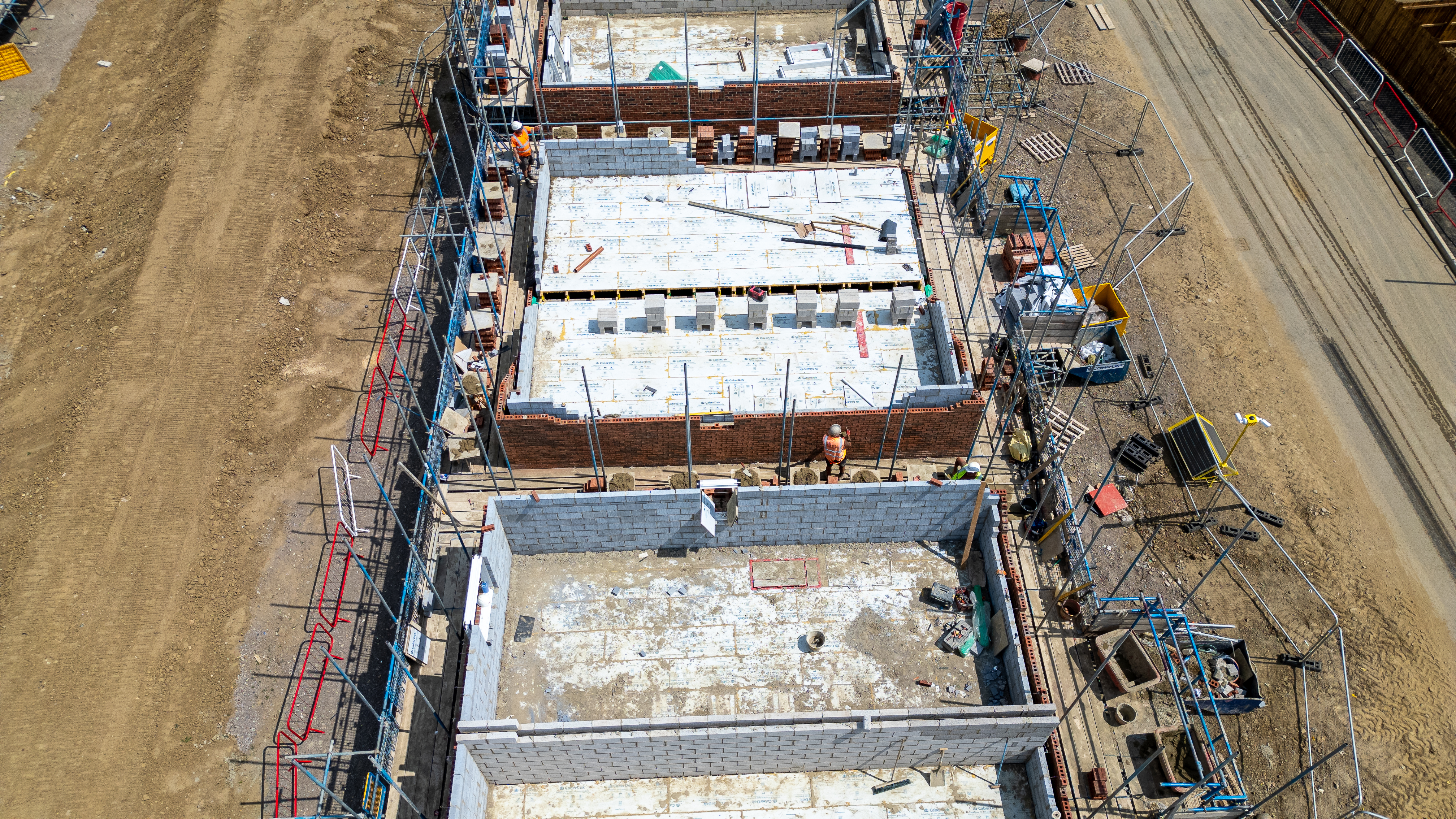 Aerial view of a construction site featuring unfinished buildings, scaffolding, and various building materials under a clear sky at Miller Homes in Catterick, UK.