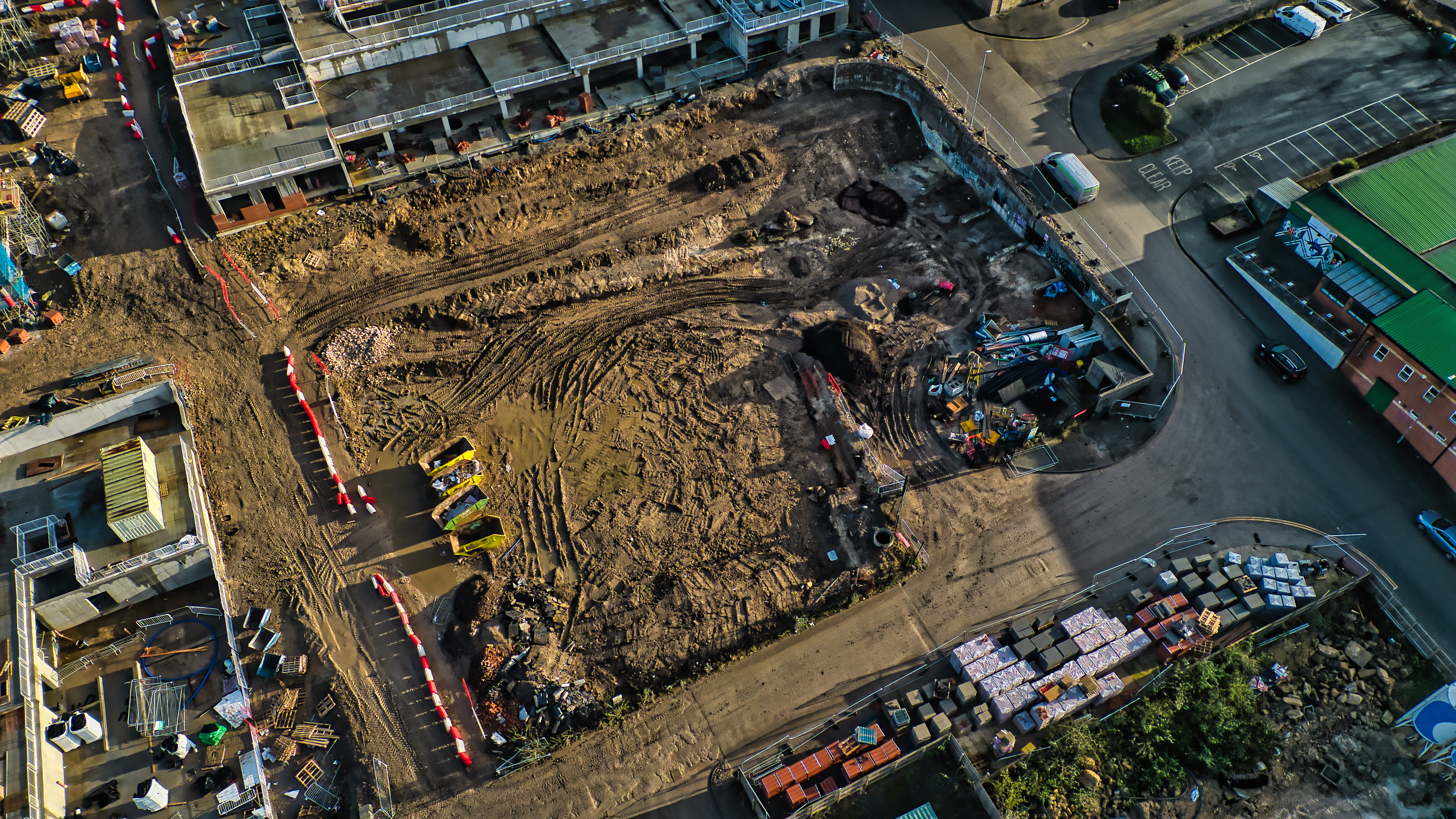 Aerial view of a construction site. Excavated earth dominates the center, surrounded by building materials, machinery, and partially completed structures. Roads and parking areas are visible nearby.