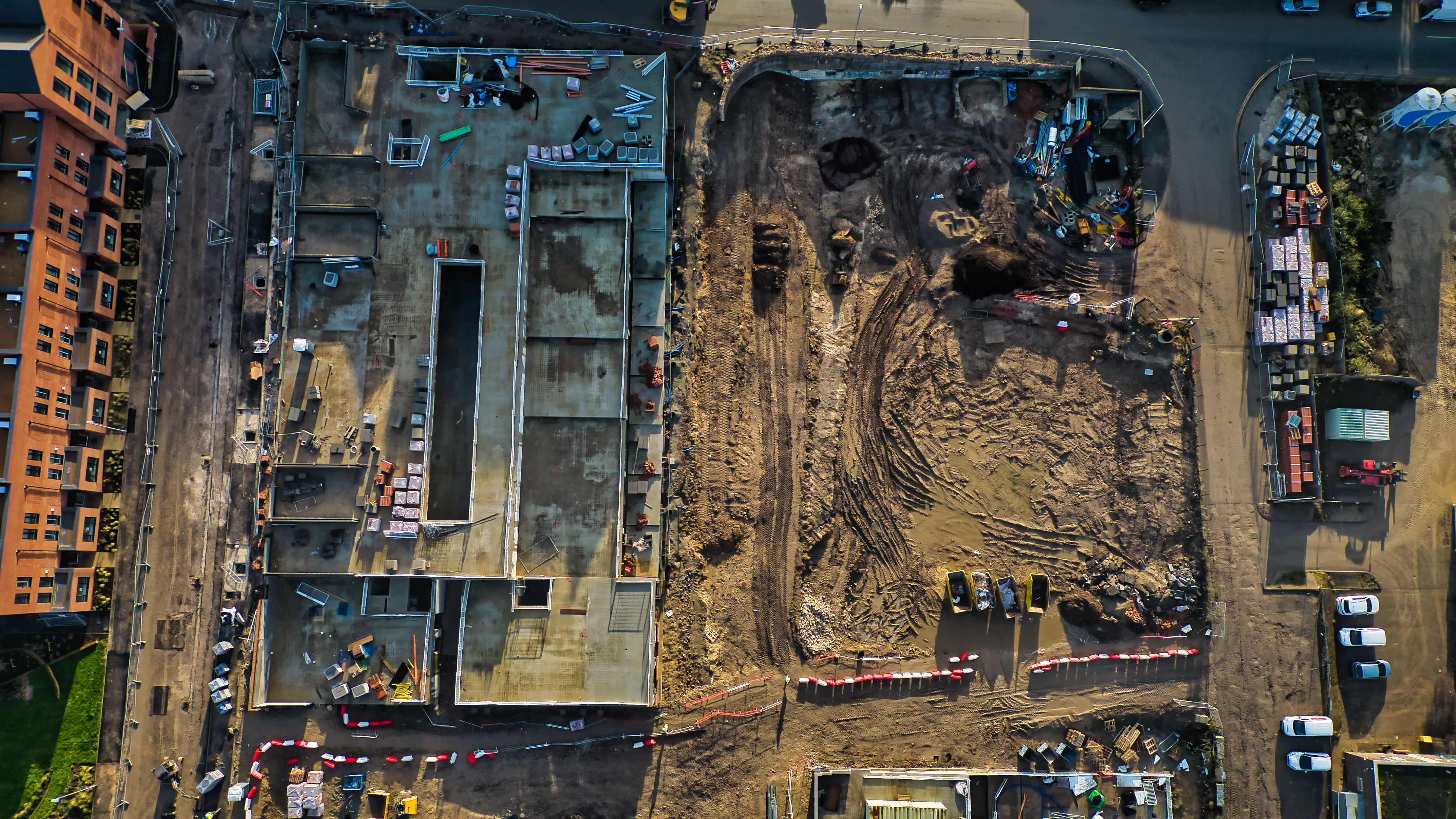 Aerial view of a construction site showing an excavated area, partially completed building, materials storage, and adjacent residential buildings. The scene displays various stages of building development.