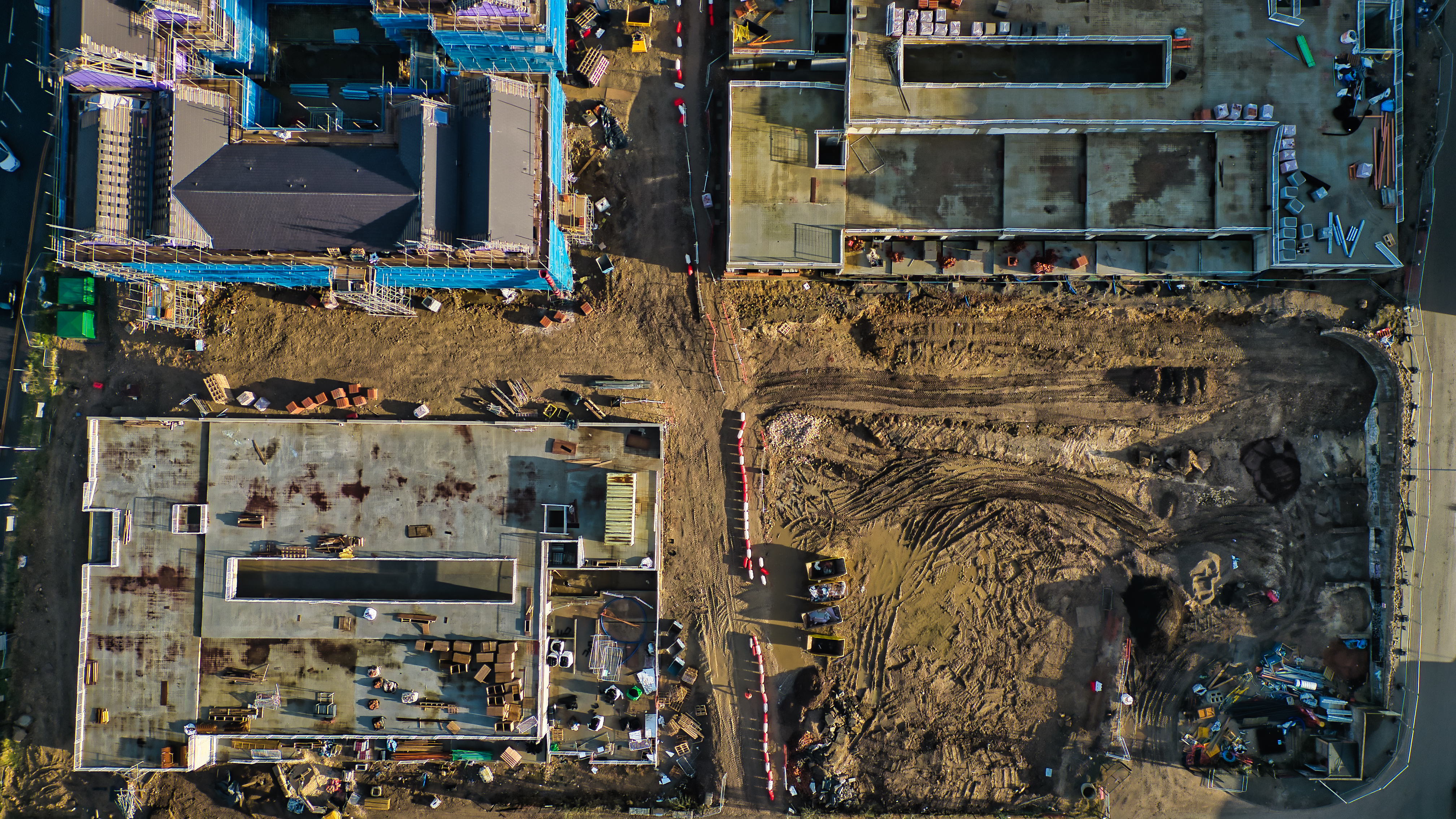Aerial view of a construction site showing two partially completed buildings, exposed earth, and construction equipment. The site is divided by muddy tracks and barriers.