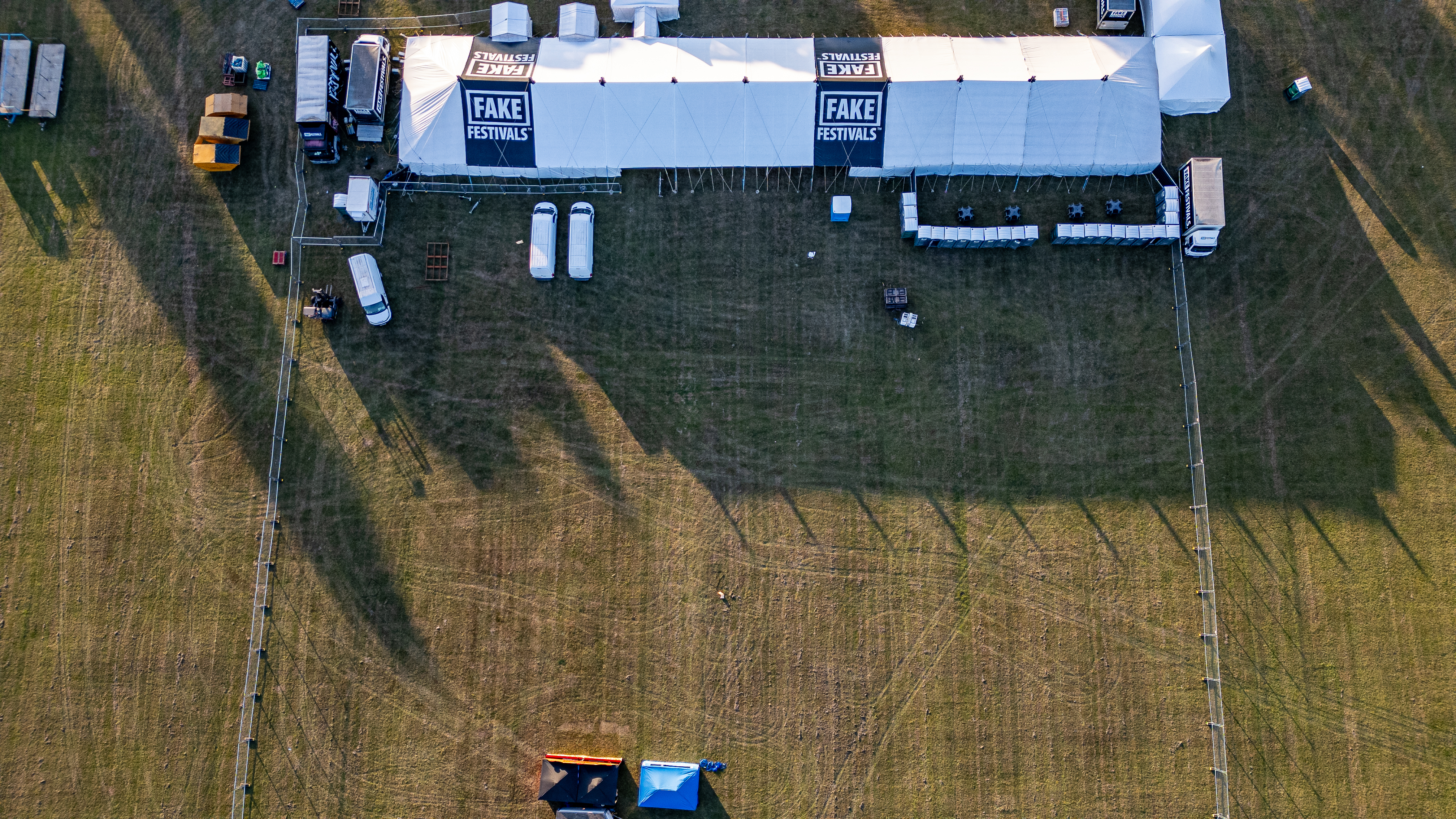 Aerial view of a large white tent with "FAKE FESTIVALS" banners, surrounded by vehicles, portable toilets, and fencing on a grassy field in Harrogate, UK.
