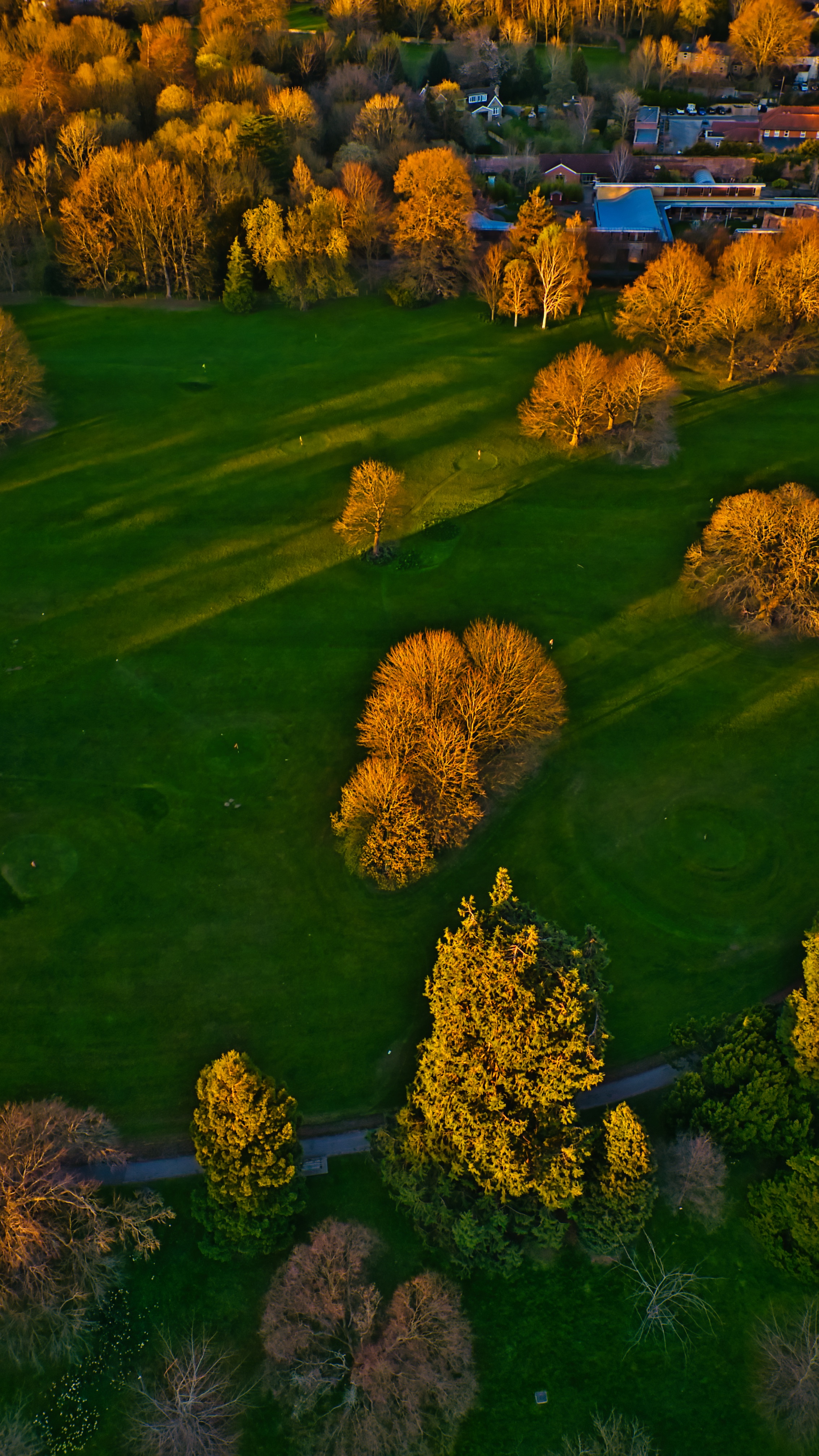 Aerial view of a green golf course with trees casting long shadows. Buildings visible in the background. Warm light in Knaresborough, UK.