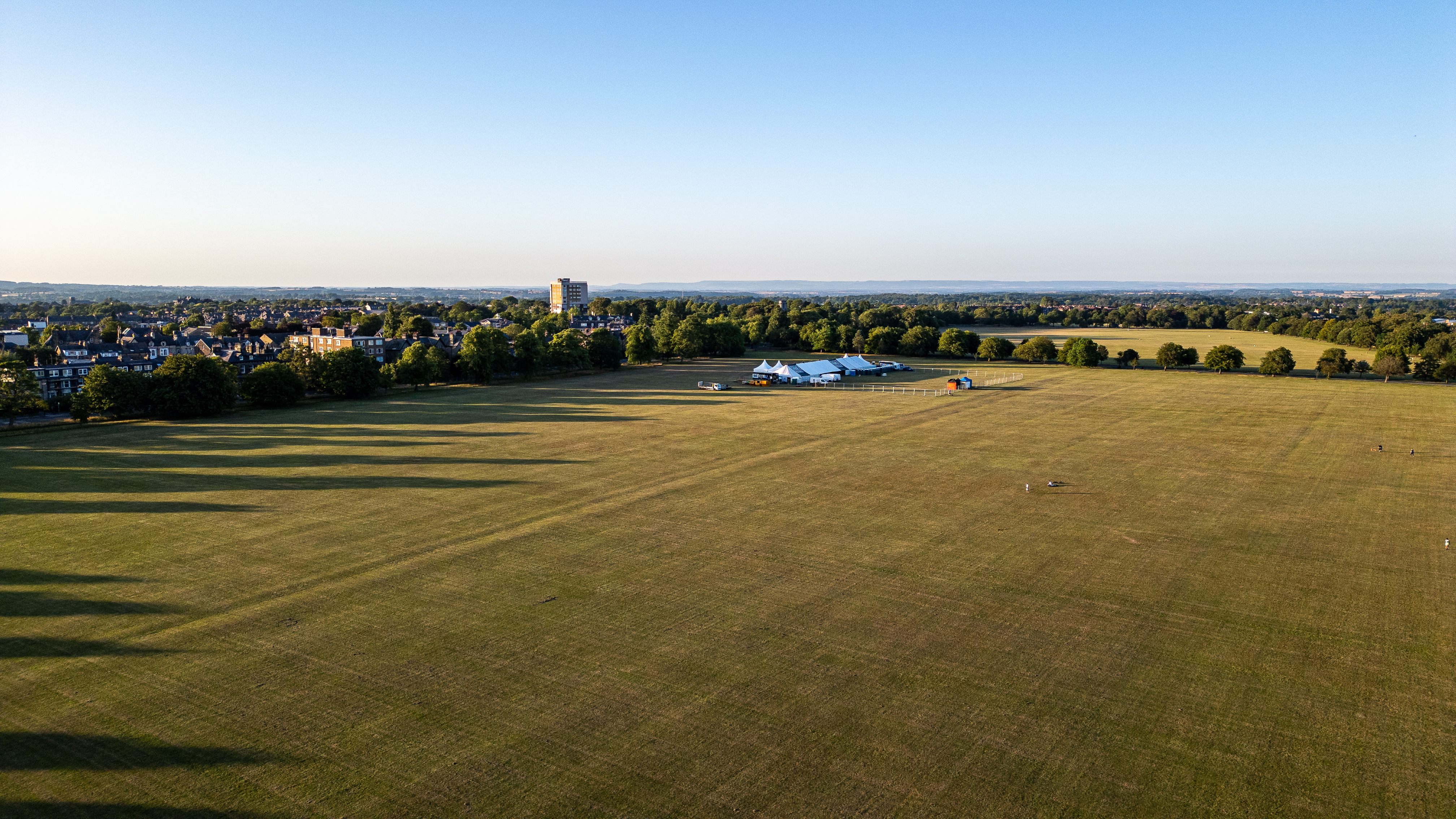 An aerial view of a large, grassy field with buildings and trees in the distance under a clear blue sky in Harrogate, UK.