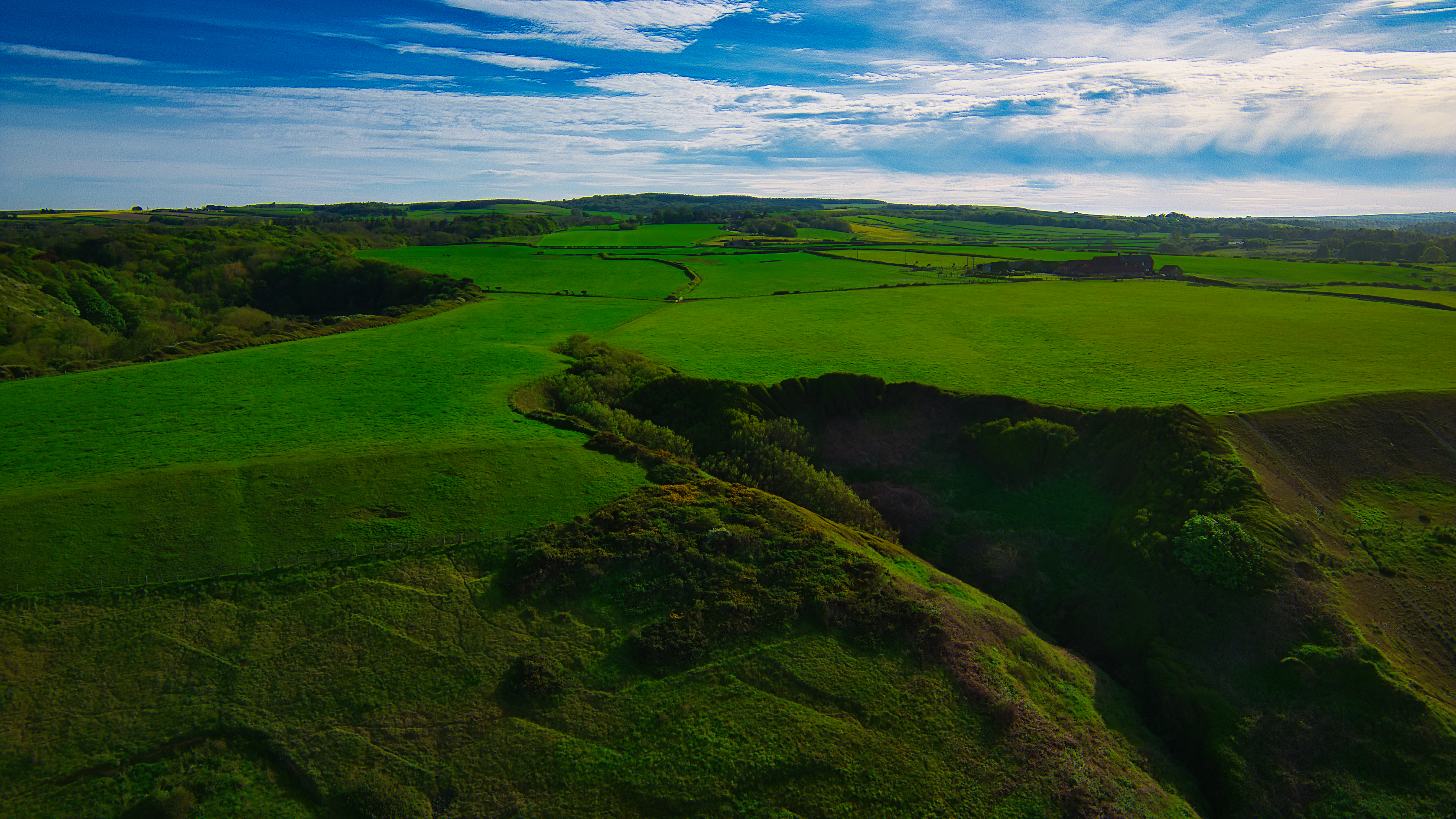 Aerial view of lush green fields and rolling hills under a partly cloudy sky. The landscape features a mix of open grasslands and patches of dense trees.