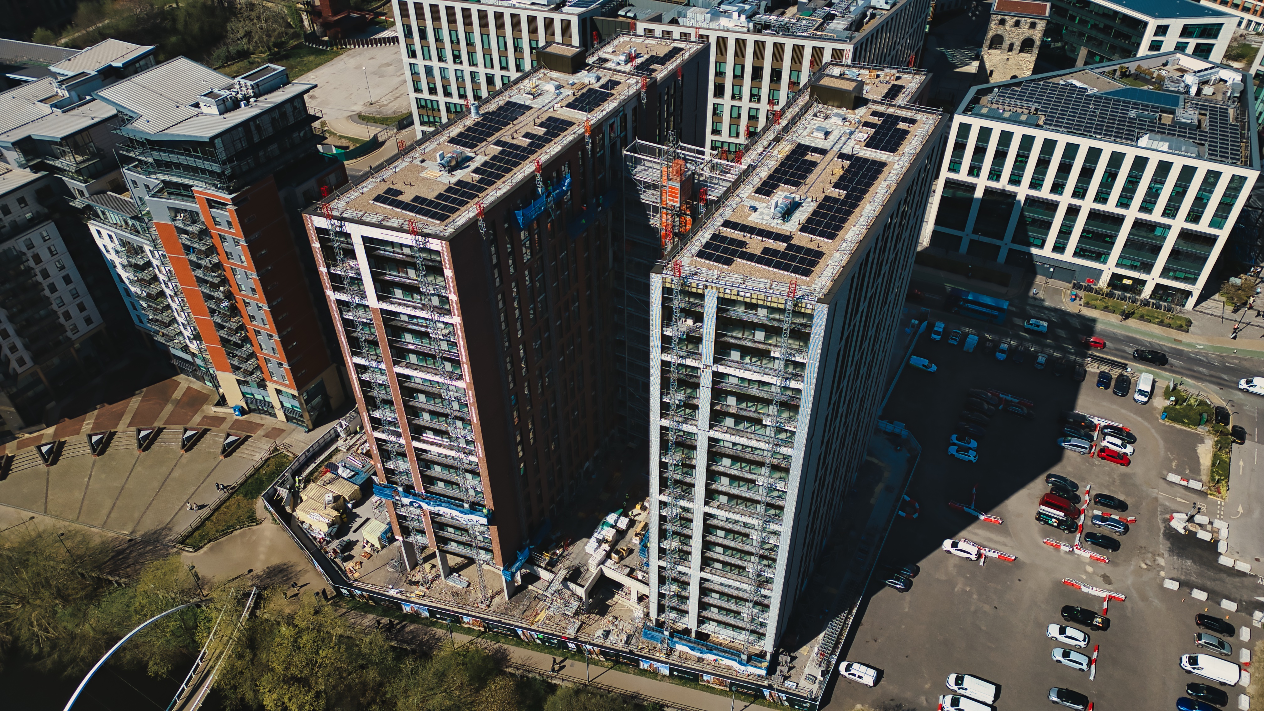 Aerial view shows high-rise buildings, some under construction, with parking lots and streets filled with cars in a modern urban environment in Leeds, UK.