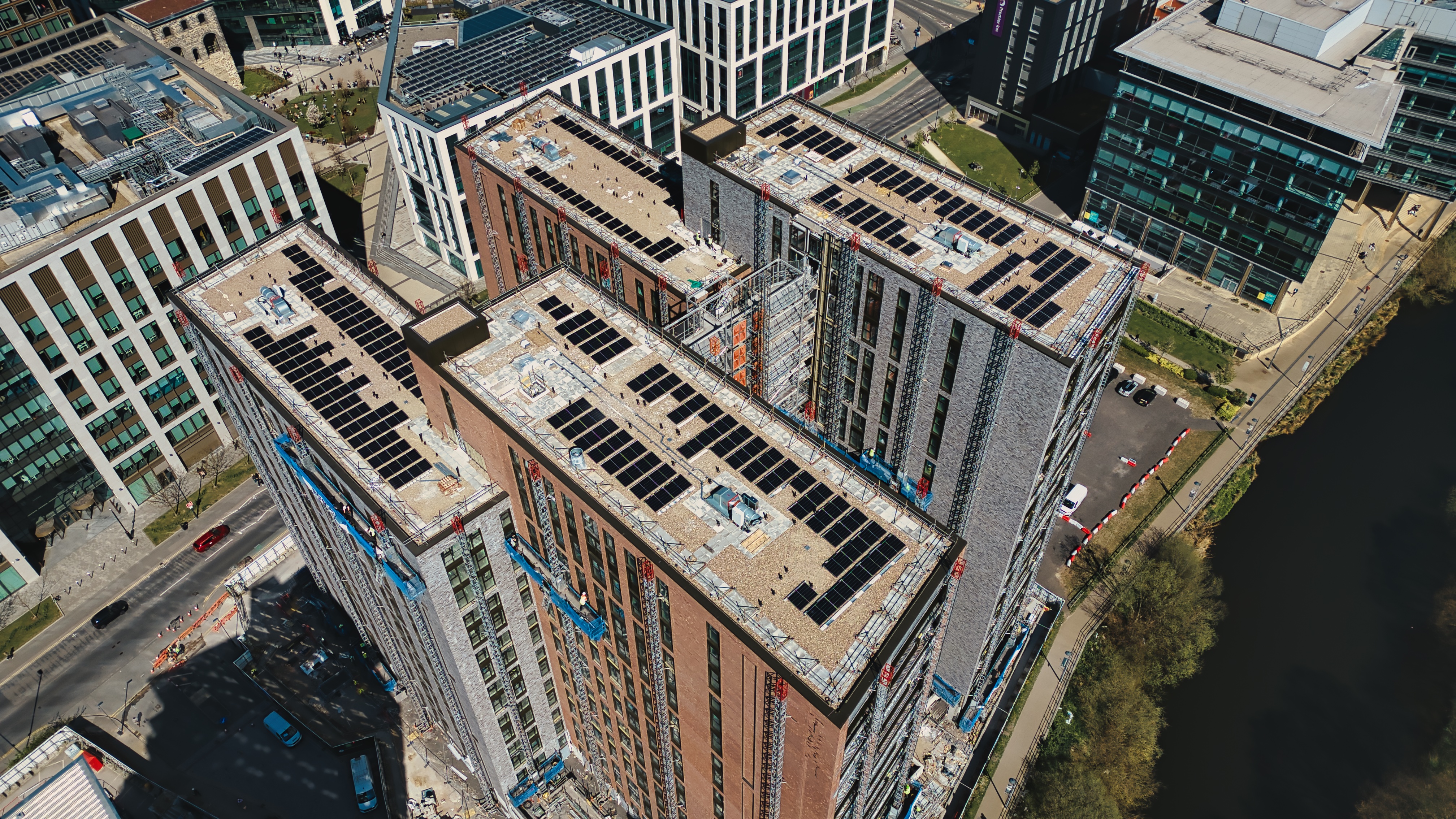 Aerial view of multiple high-rise buildings with solar panels on their roofs in an urban environment in Leeds, UK.