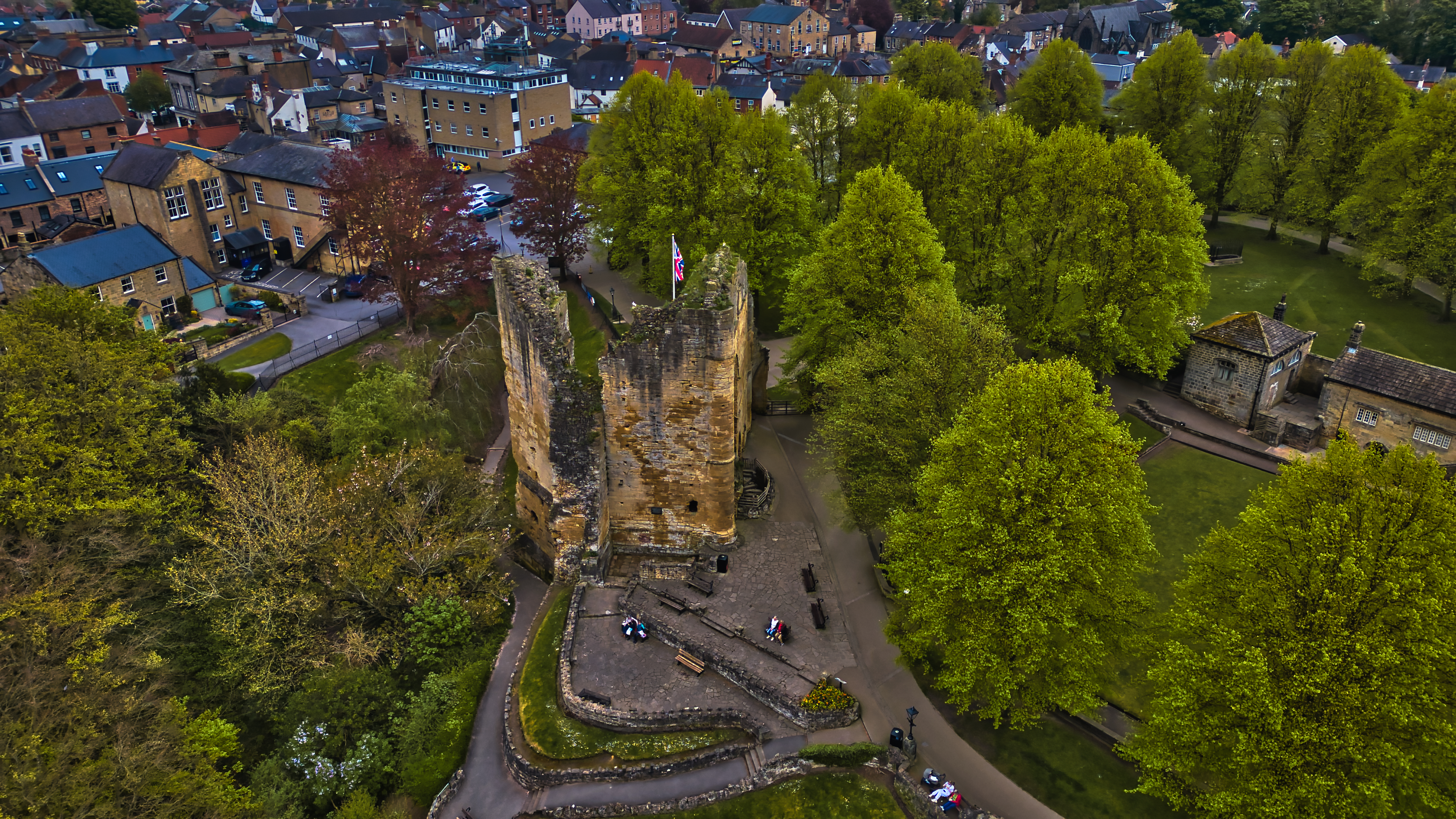 Aerial view of an ancient castle surrounded by lush green trees in a quaint town, with people walking around the site.
