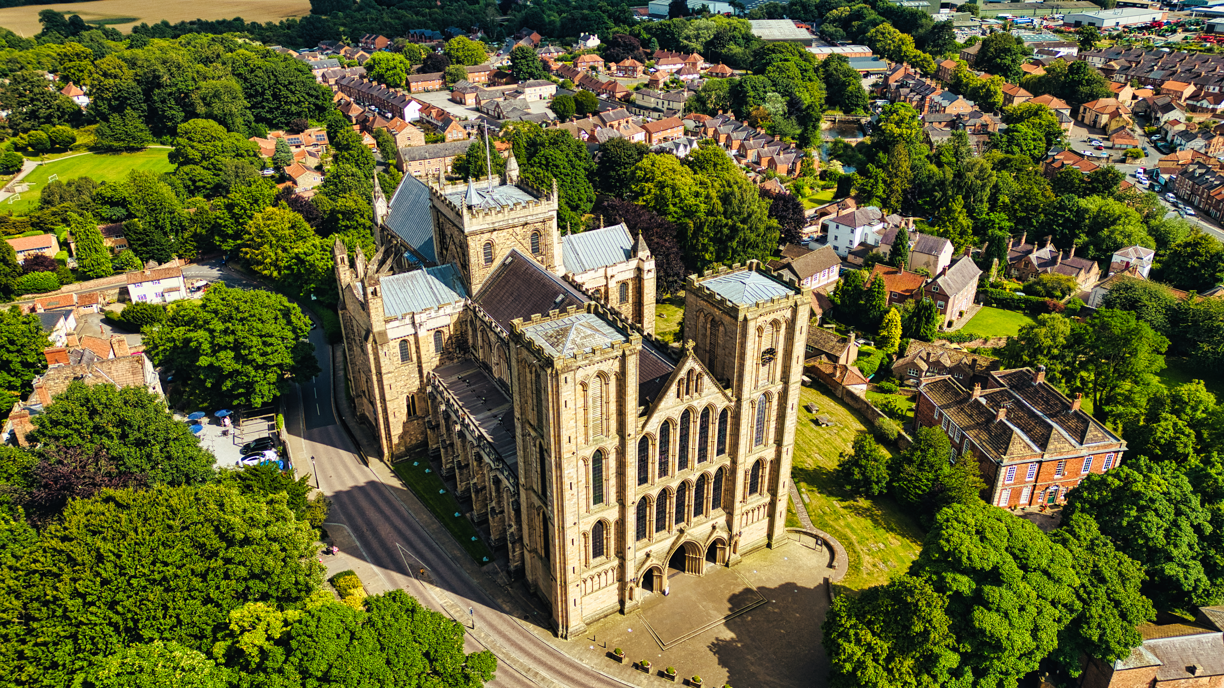 Aerial view of a large, historic cathedral surrounded by lush greenery and residential buildings. The cathedral features tall spires and intricate architectural details, set against a backdrop of trees and a small town.