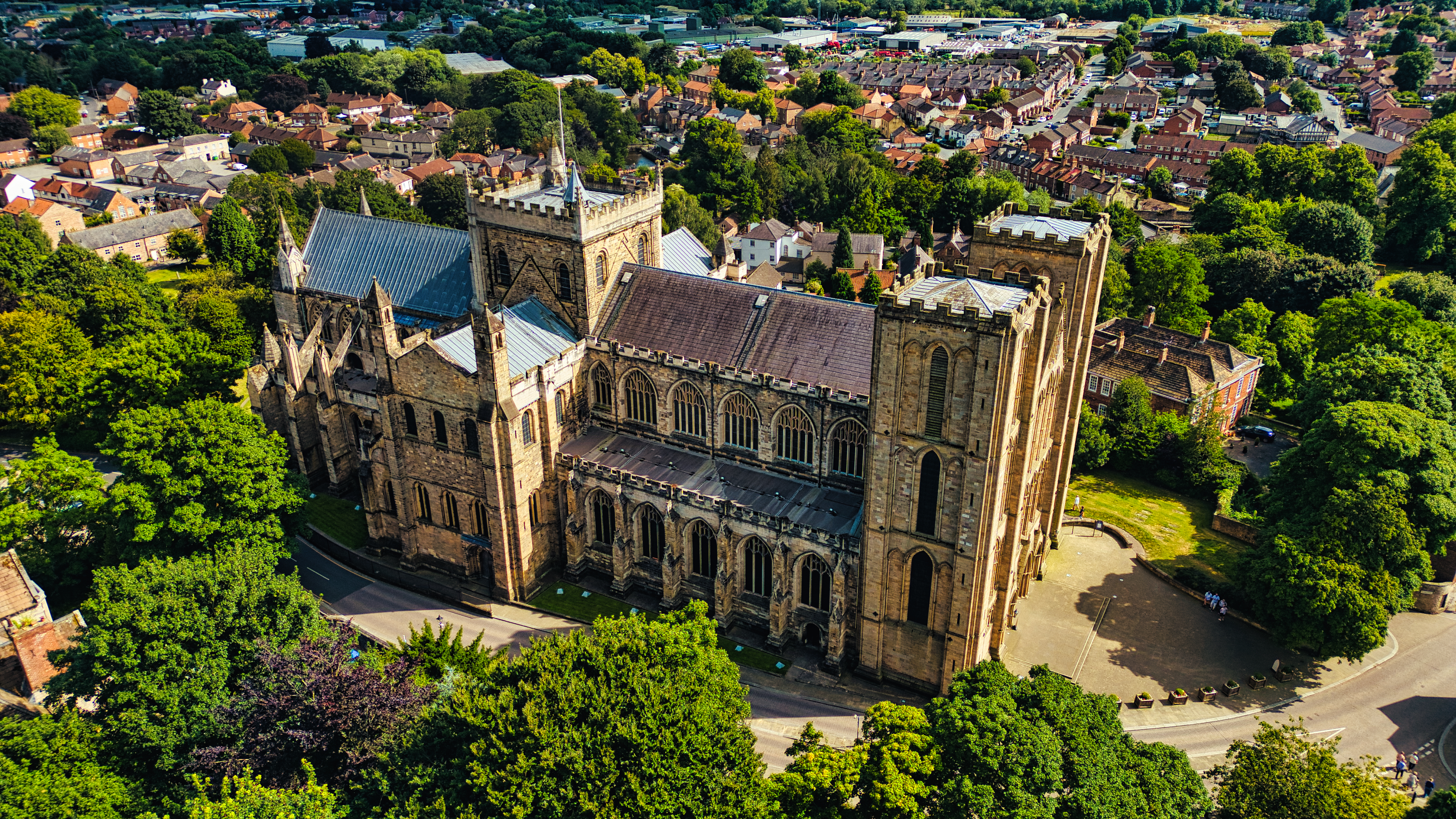 Aerial view of a large historic cathedral surrounded by trees and residential buildings. The cathedral features intricate architecture with tall spires and large windows, set against a backdrop of a small town.