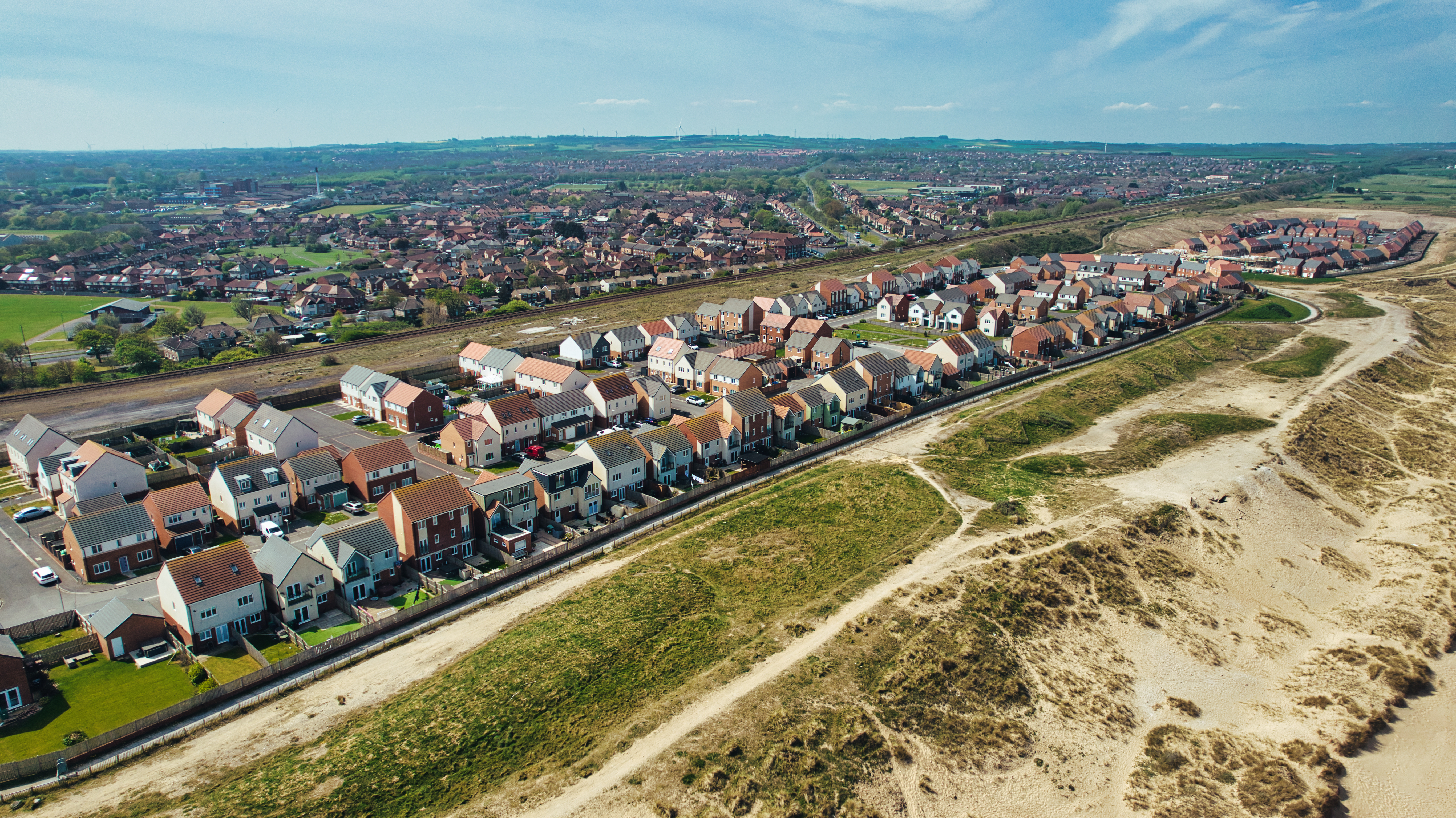 Aerial view of a residential area adjacent to a sandy, grassy landscape, with another town visible in the background under a partly cloudy sky at Steetley Pier, UK.