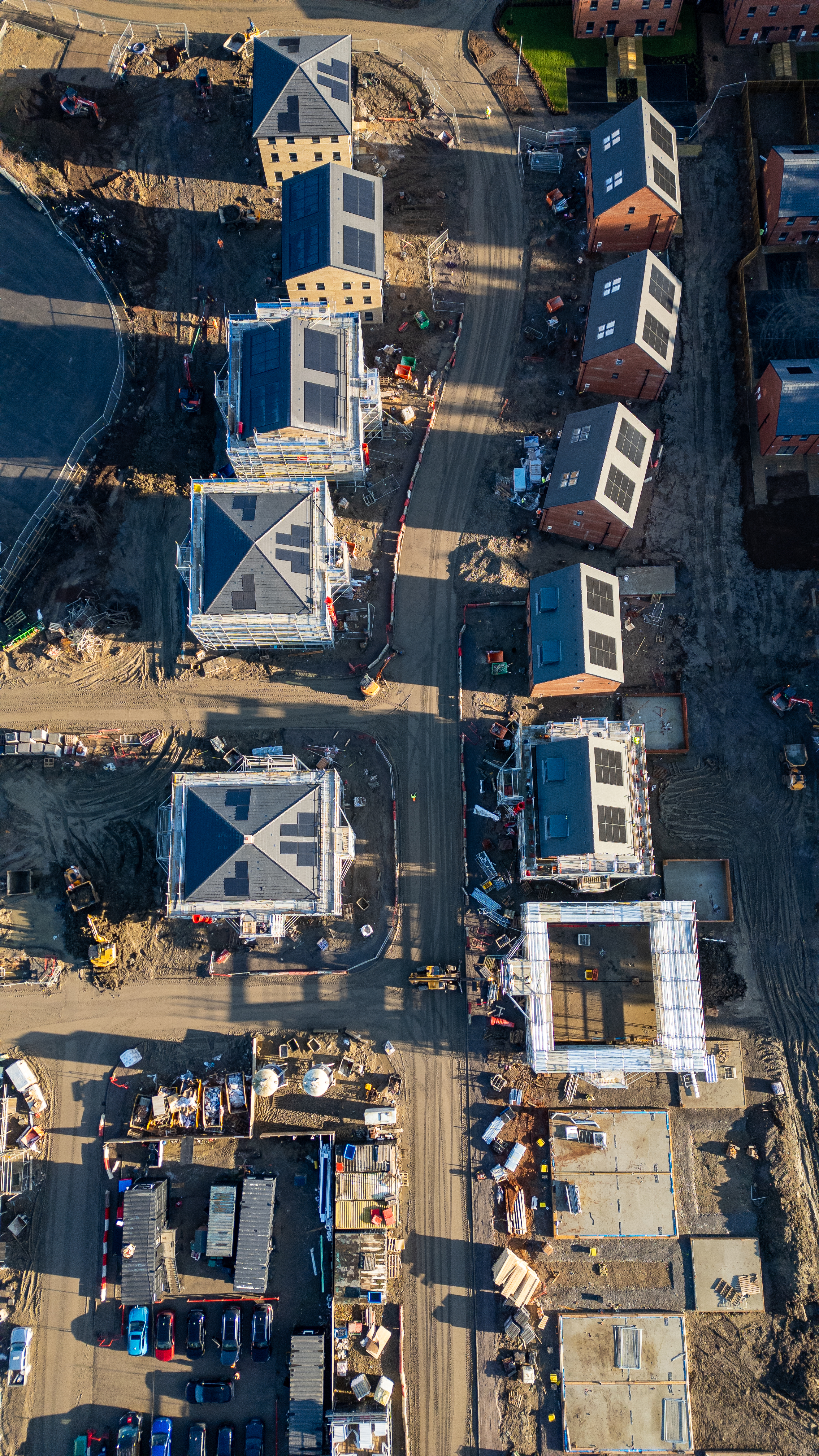 Aerial view of a housing development under construction, showing unfinished houses, construction equipment, and materials on a sunny day at Desire by Strata Homes in Leeds, UK.