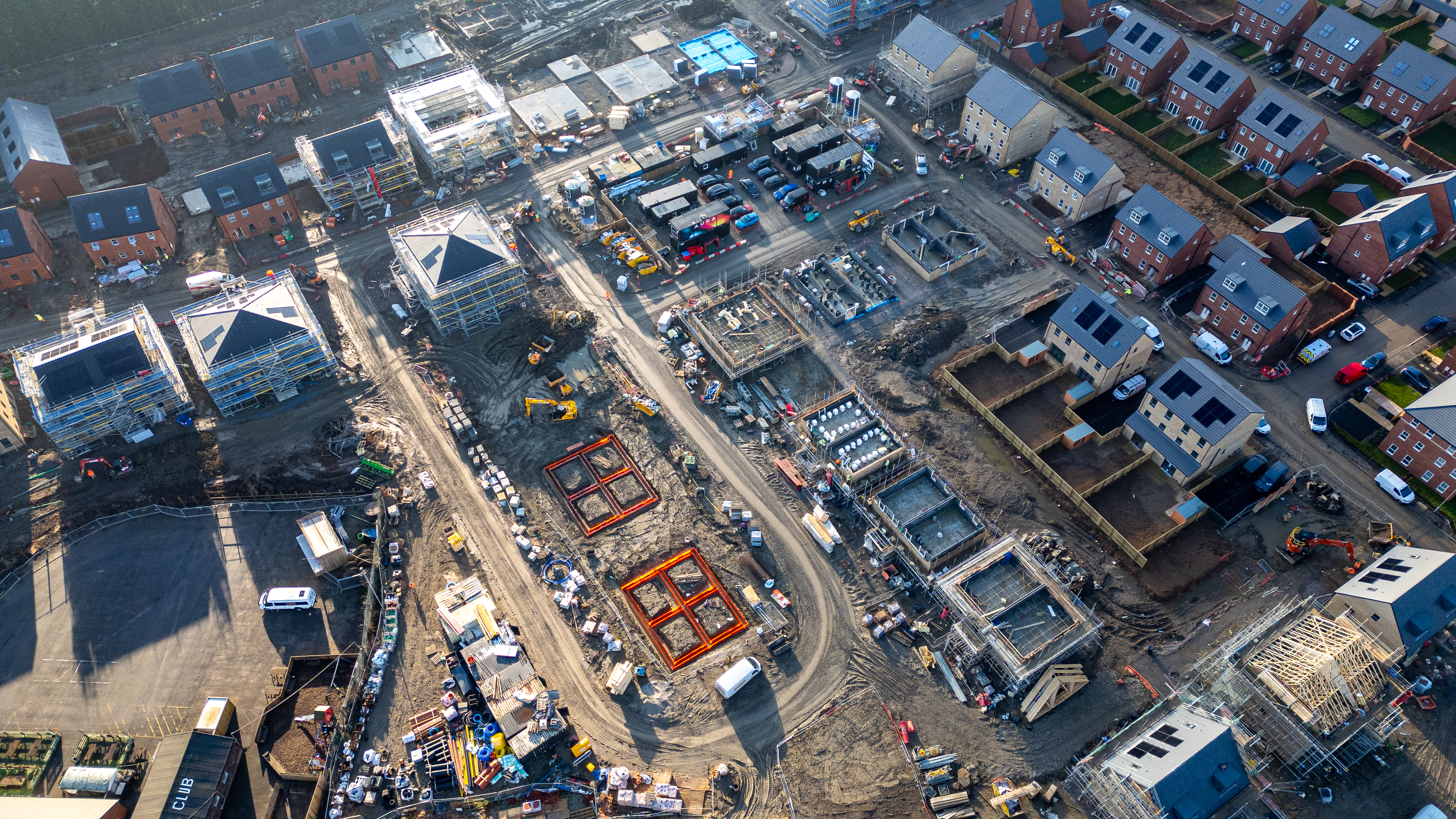 Aerial view of a housing development under construction, showing foundations, partially built houses with scaffolding, and completed homes at Desire by Strata Homes in Leeds, UK.