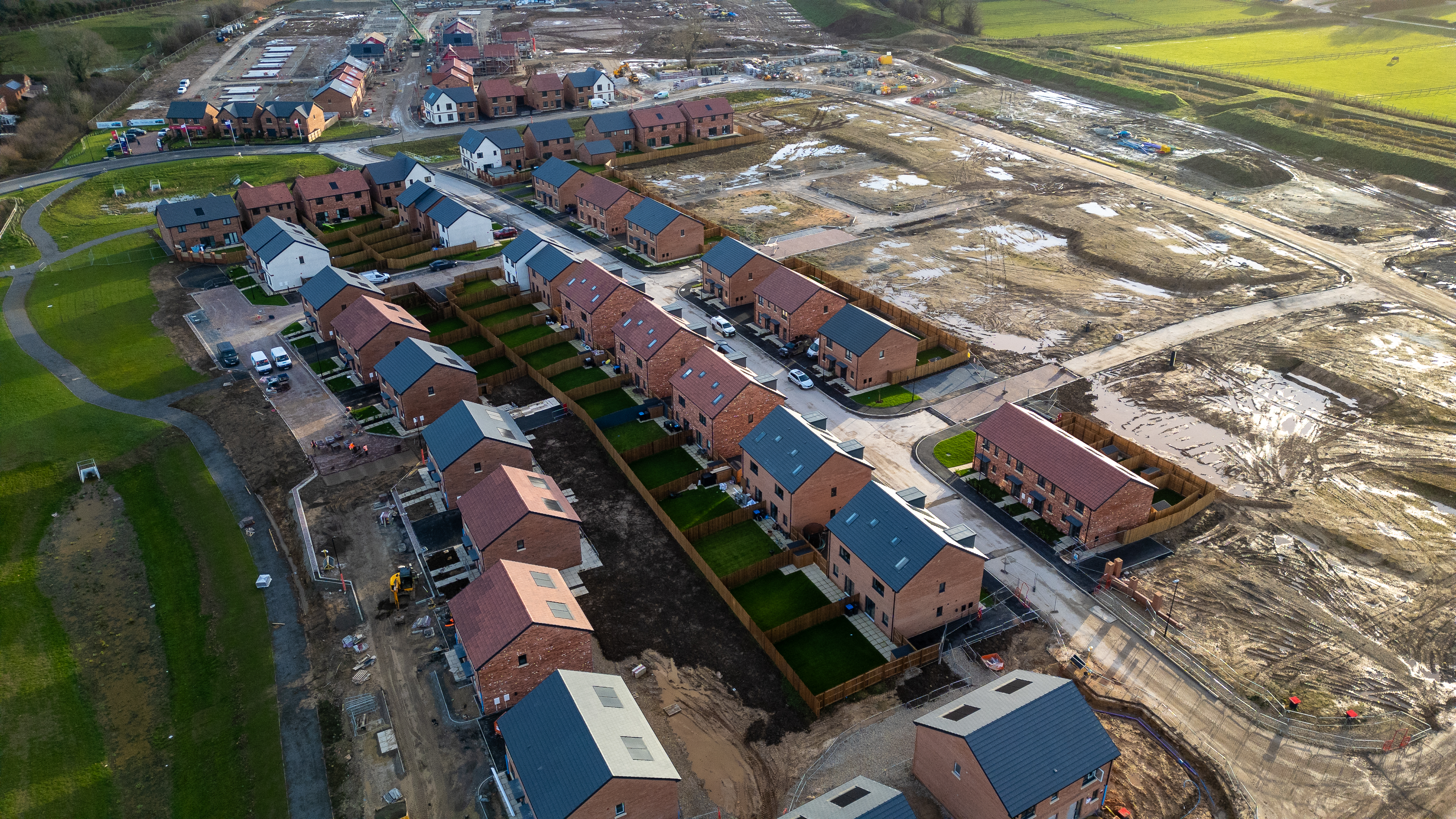 Aerial view of a housing development under construction. New brick houses with tiled roofs are visible, alongside partially cleared land and roads at Taylor Wimpey, Ripon.