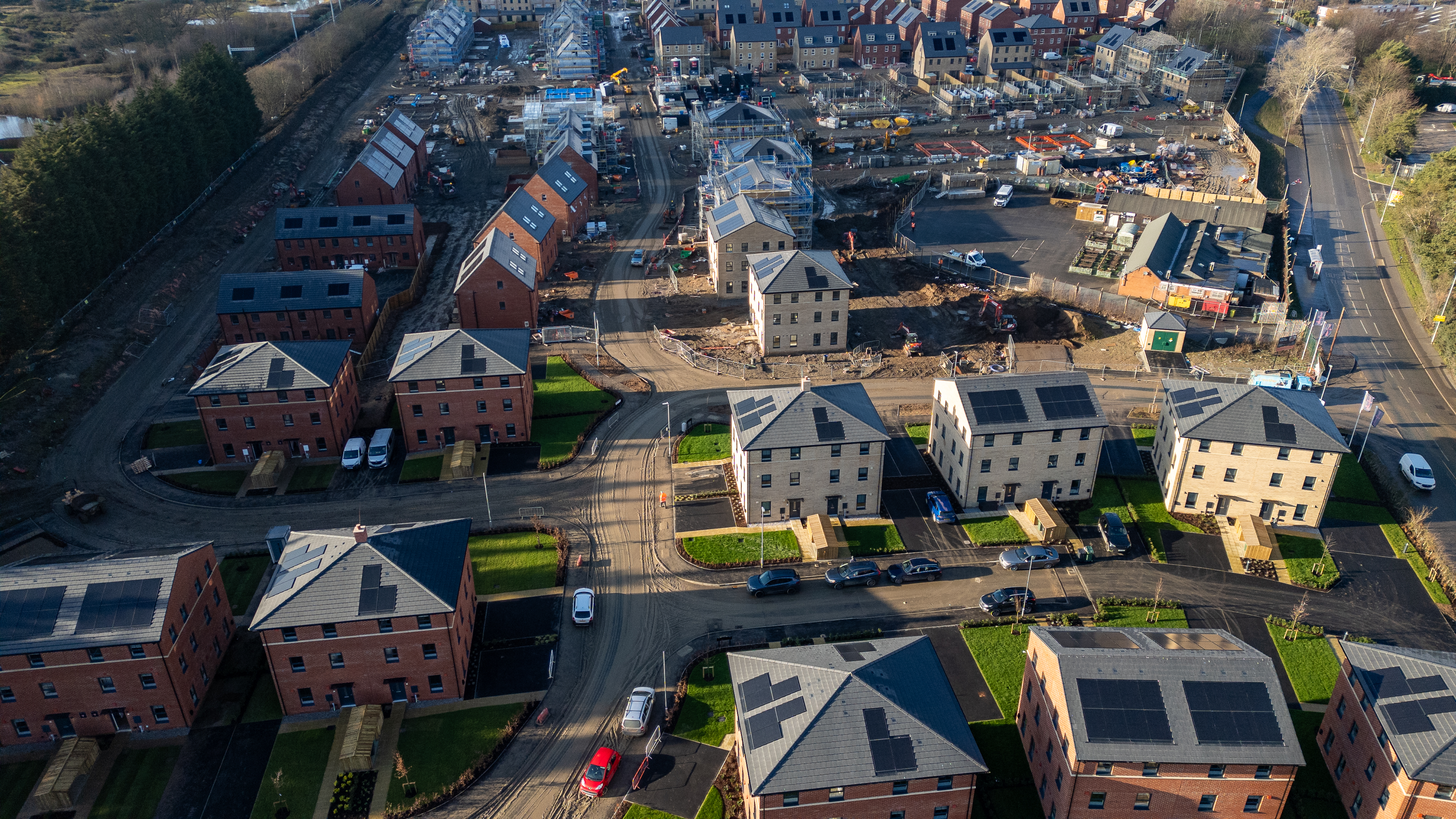 Aerial view of a housing development under construction, showing rows of brick and stone houses with solar panels, roads, and construction activity at Desire by Strata Homes in Leeds, UK.