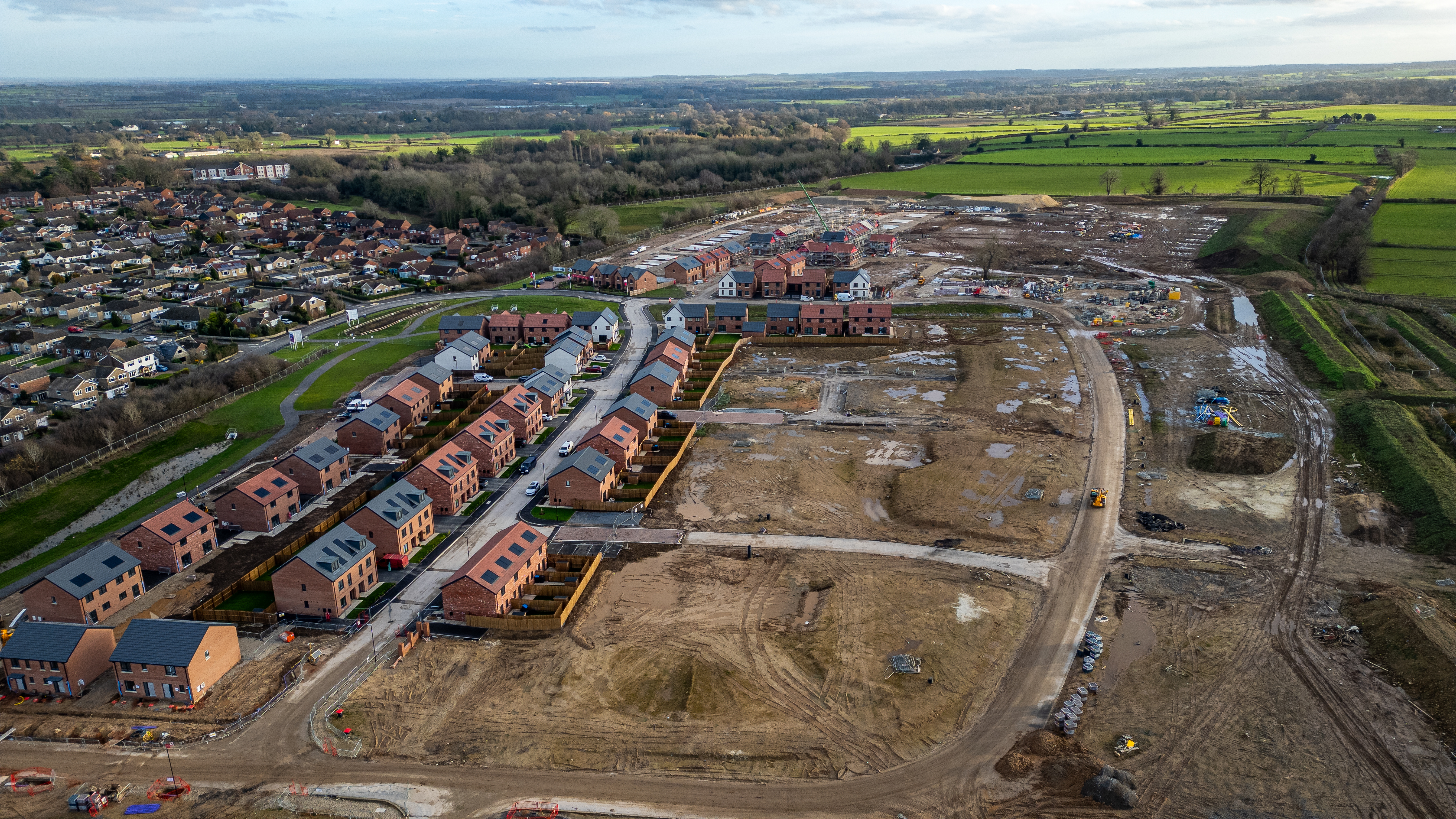 Aerial view of a housing development in progress, showing newly built houses alongside a construction site with heavy machinery at Taylor Wimpey, Ripon.