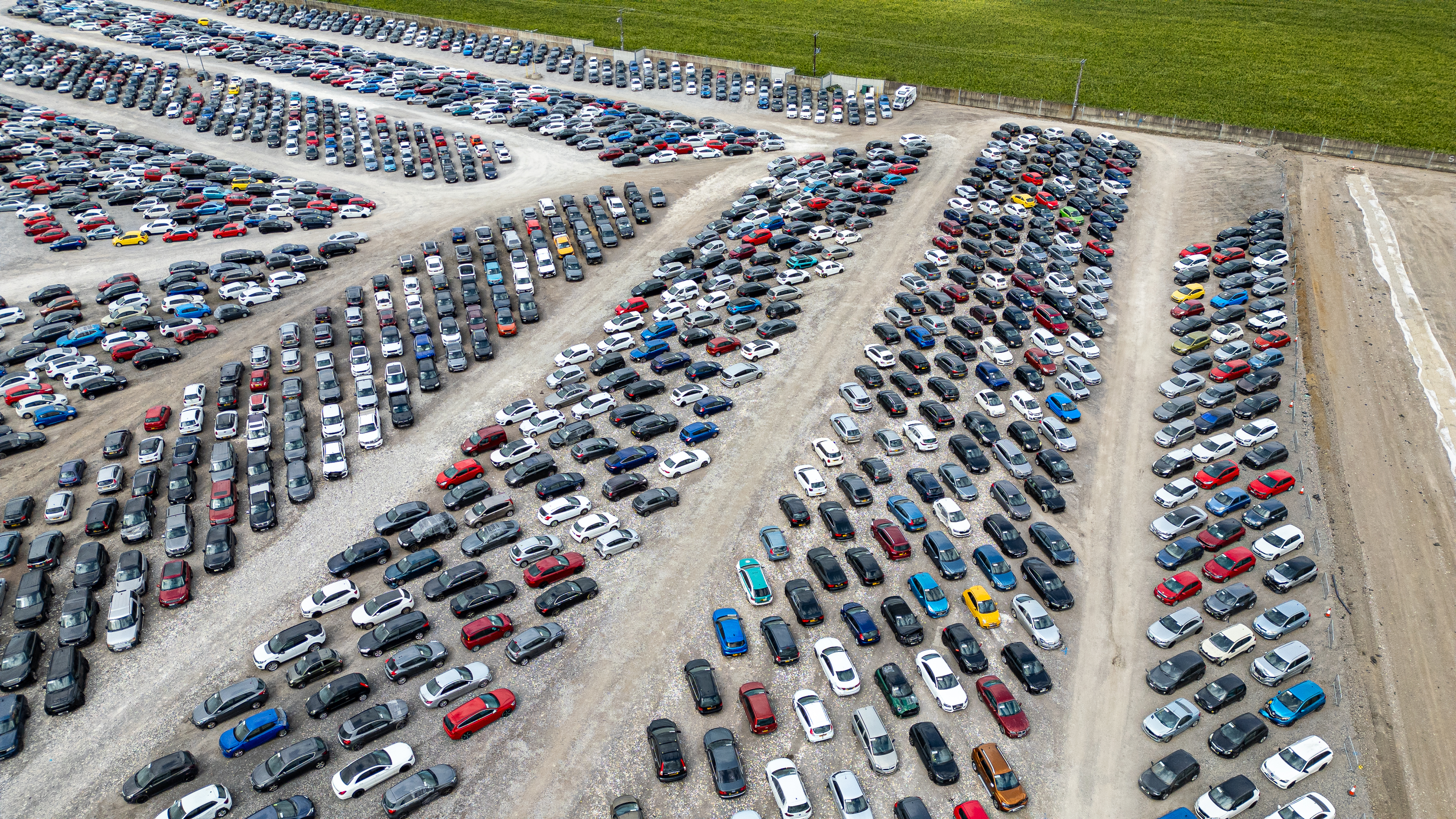 An aerial view captures an expansive car lot filled with numerous vehicles parked in neat rows. The lot is a mix of gravel and dirt, bordered by a vibrant green field at Copart yard in York, UK.