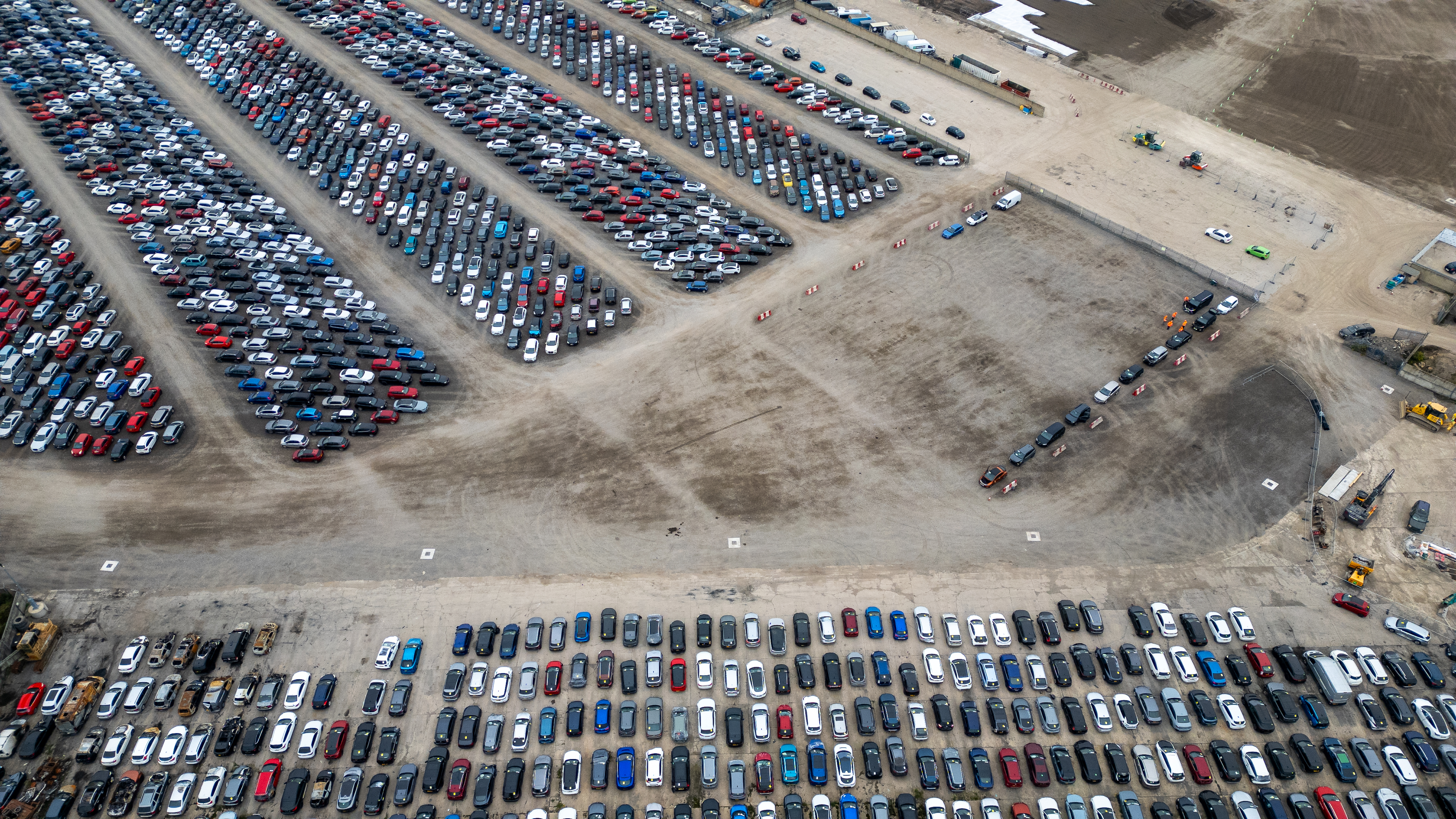 Aerial view of a massive car storage lot filled with rows of vehicles. Different colors and types of cars are visible at Copart yard, York, UK.