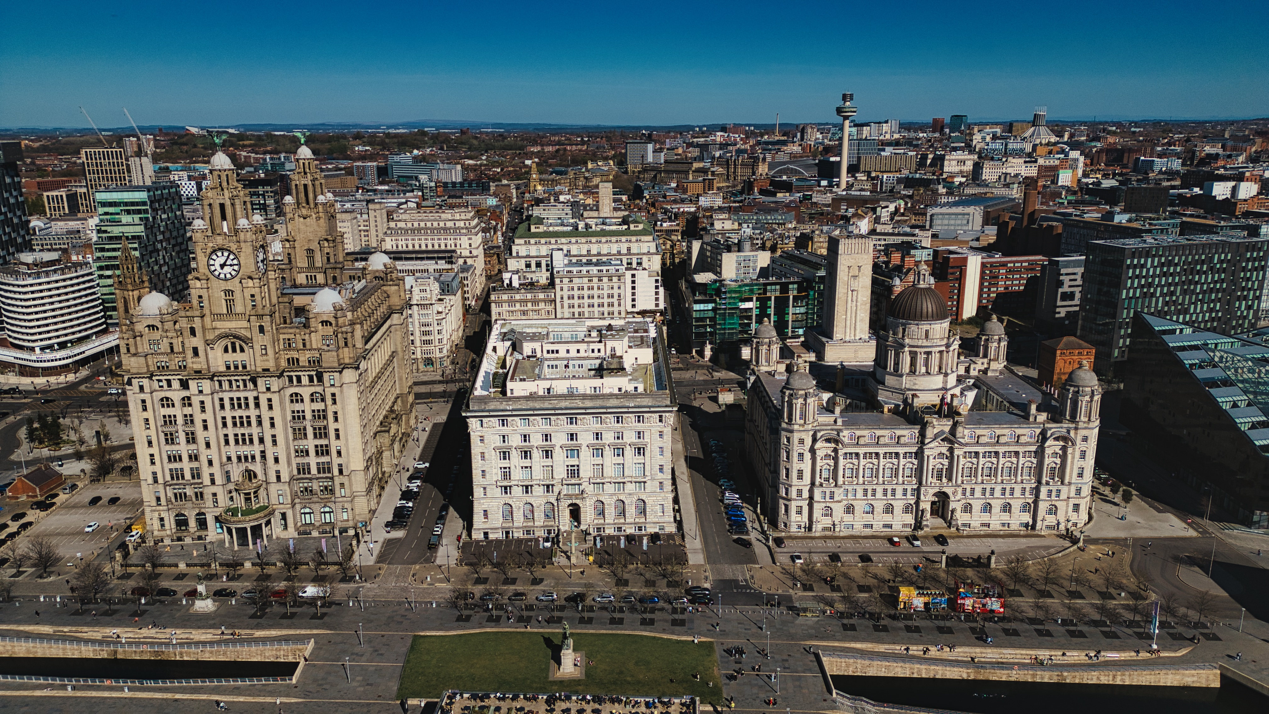 Aerial view of Liverpool featuring the Three Graces, buildings, roads, and skyline under a bright blue sky.