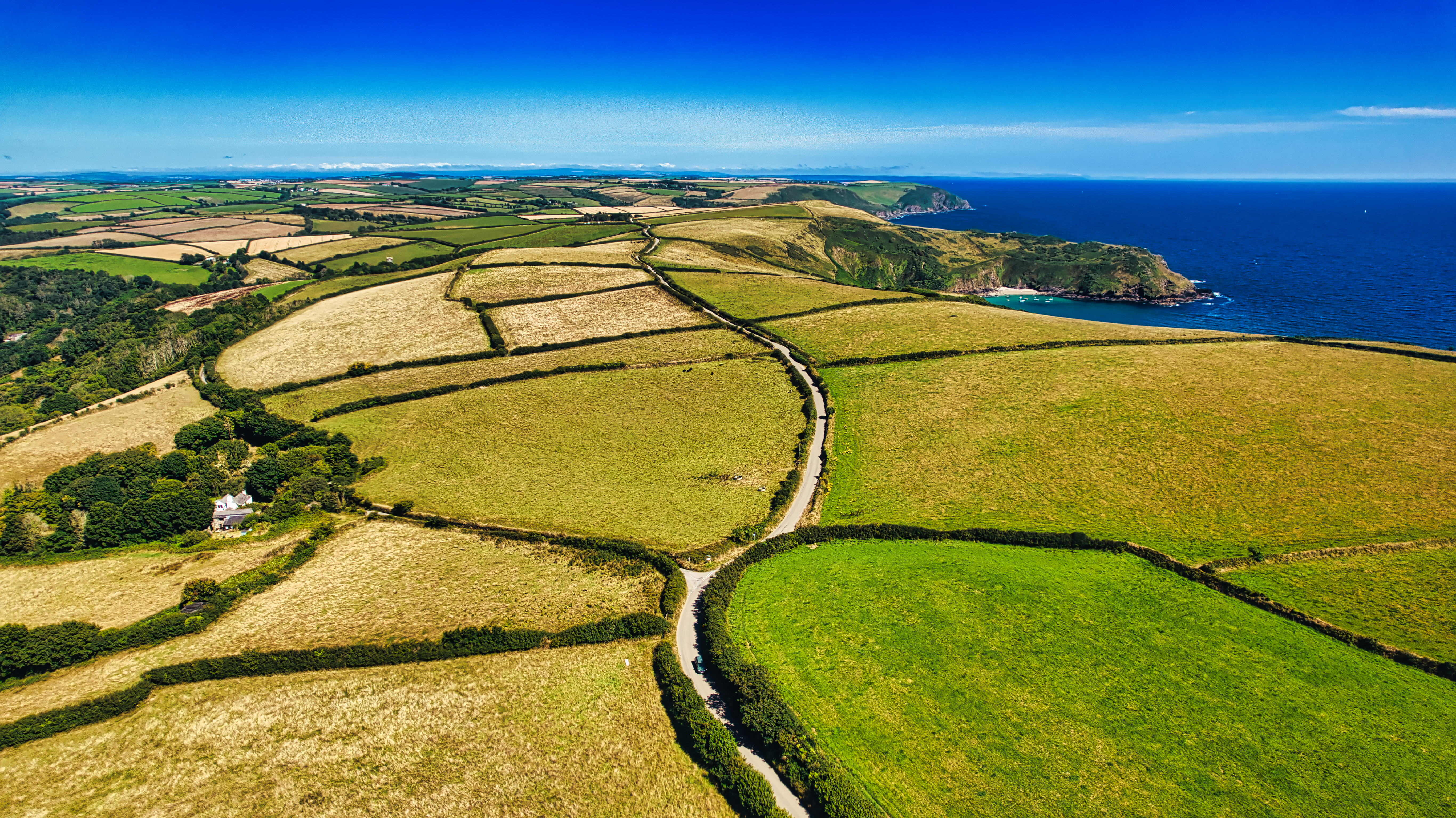 Aerial view of lush green fields and hedgerows leading to a coastline. The landscape features patchwork fields, a winding road, and a clear blue sky. The ocean is visible in the distance, enhancing the scenic beauty of the countryside.