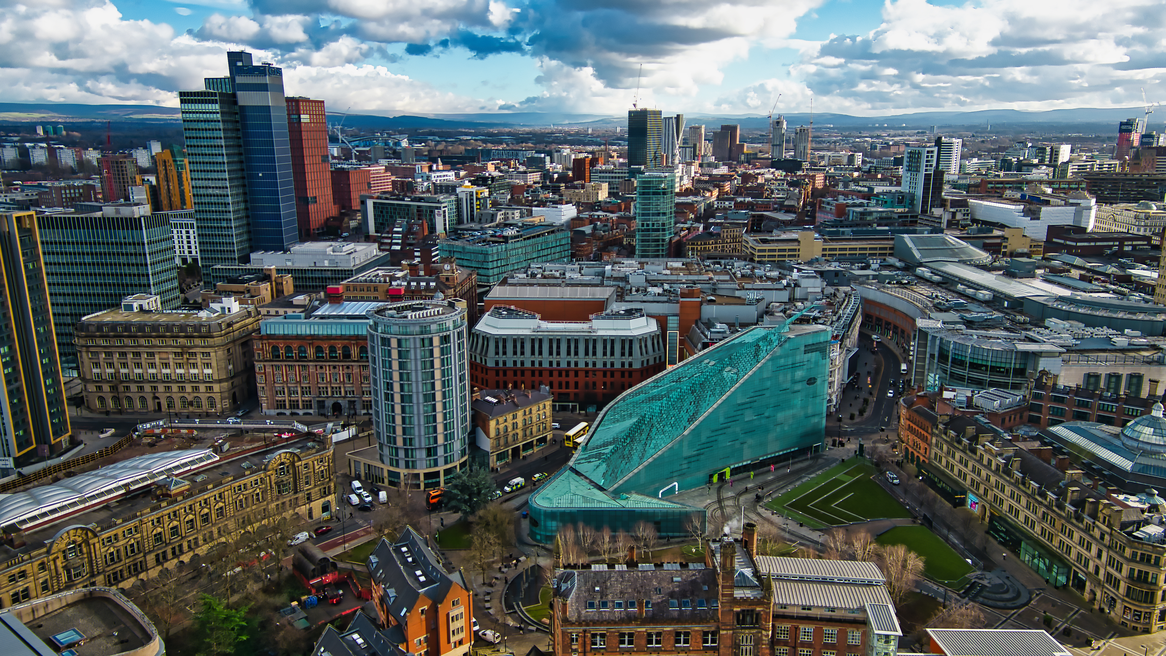 Aerial view of Manchester city center, showcasing a mix of modern and historic architecture, including skyscrapers and the distinctive green-blue clad building. A sprawling urban landscape under a partly cloudy sky.