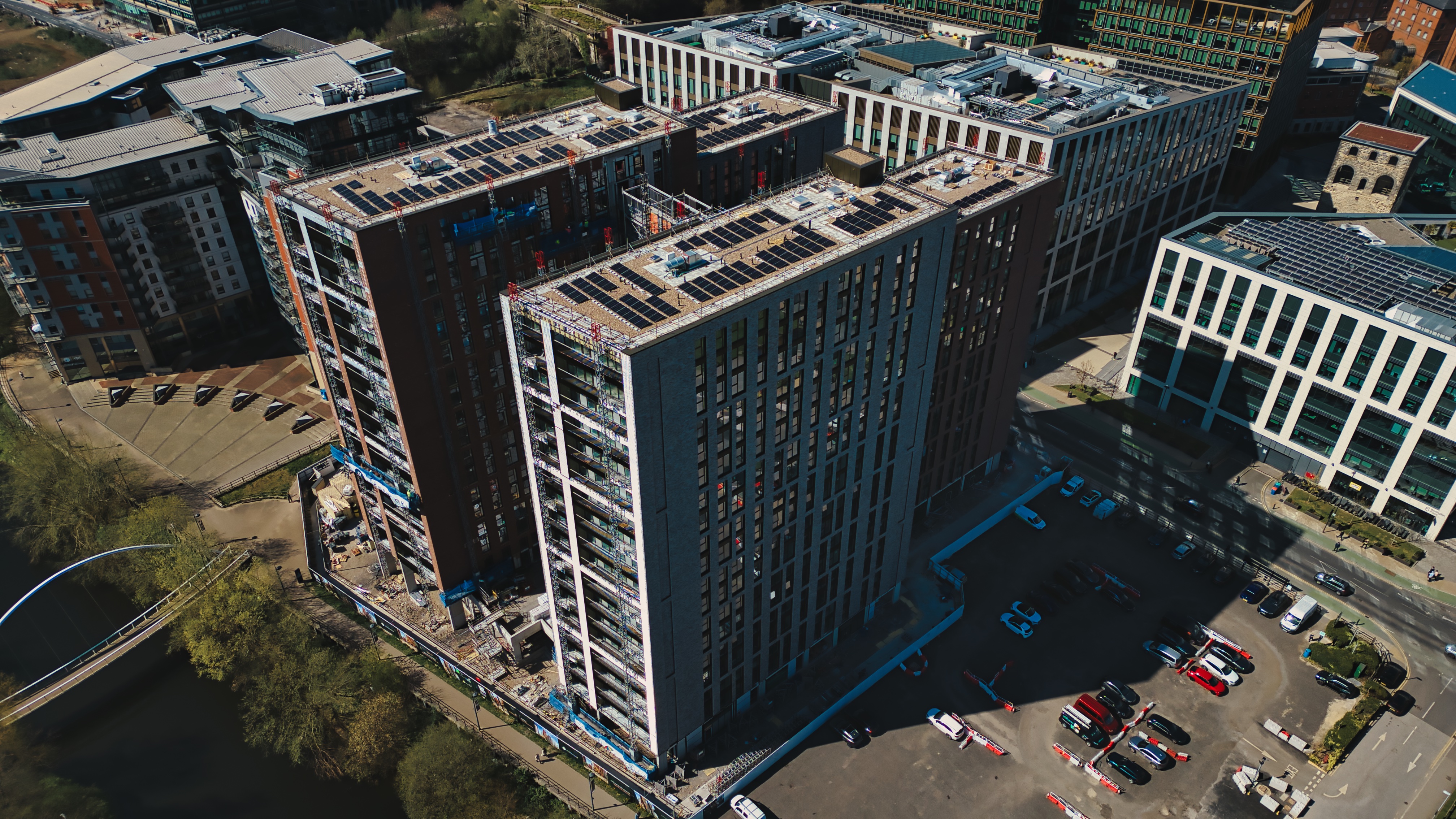 Aerial view of modern apartment buildings and office complexes with solar panels and parking lot, near a river with a pedestrian bridge in Leeds, UK.