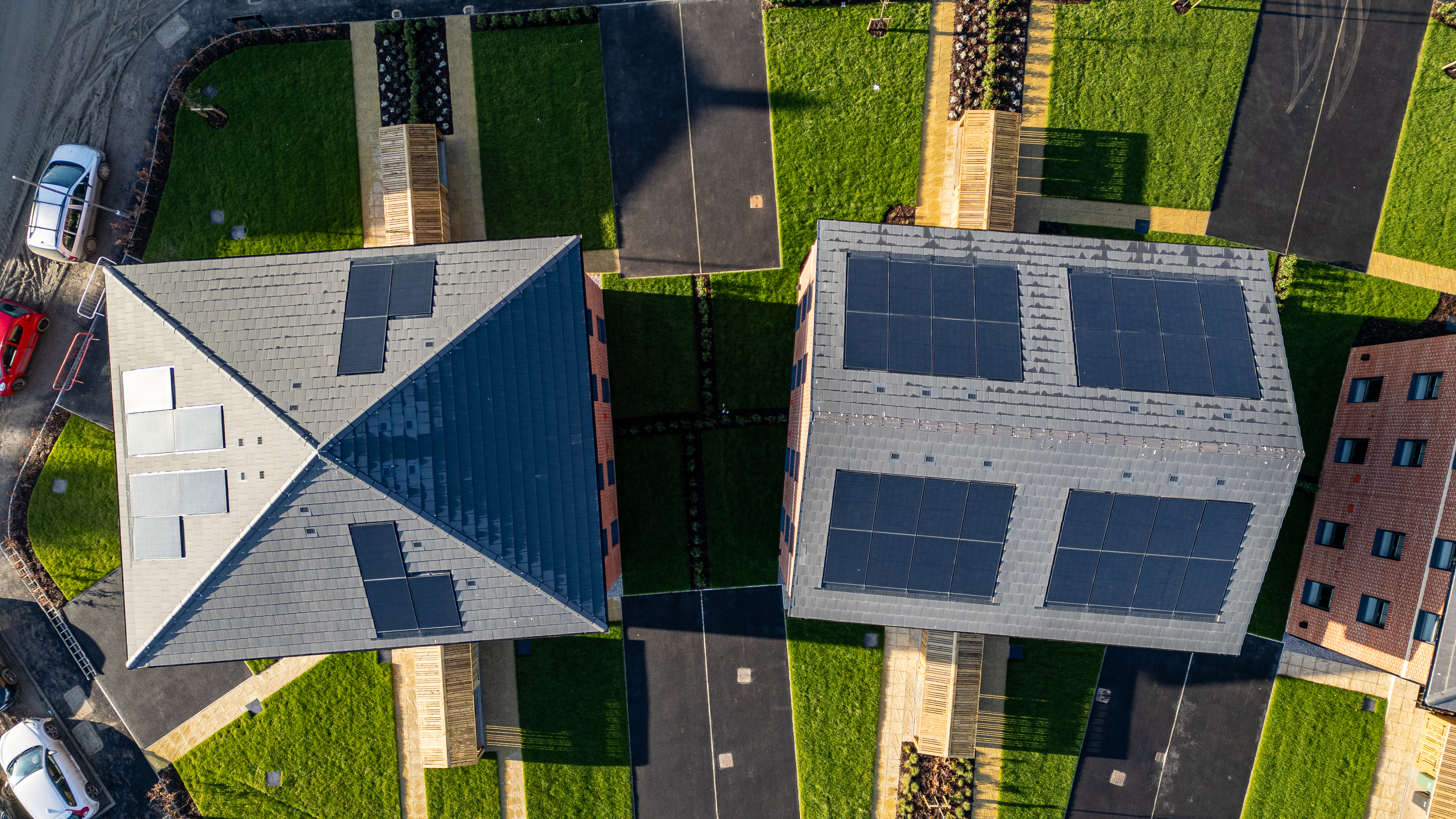 Aerial view of modern residential buildings with solar panels on grey tiled roofs, surrounded by green lawns and paved pathways at Desire by Strata Homes in Leeds, UK.