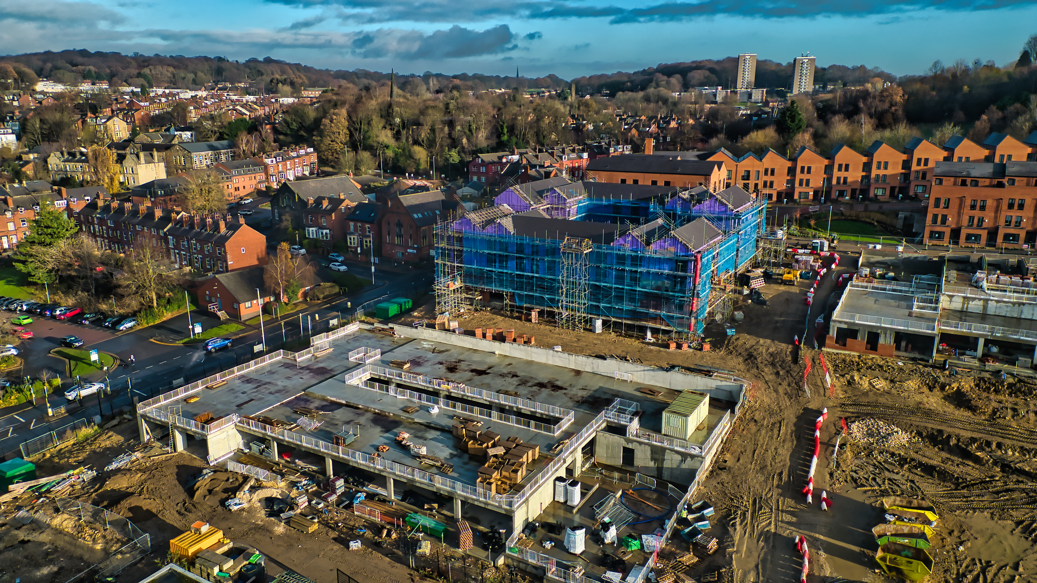 Aerial view of a construction site in a residential area. A multi-story building is under construction, surrounded by other buildings and groundwork. The site shows various stages of development.