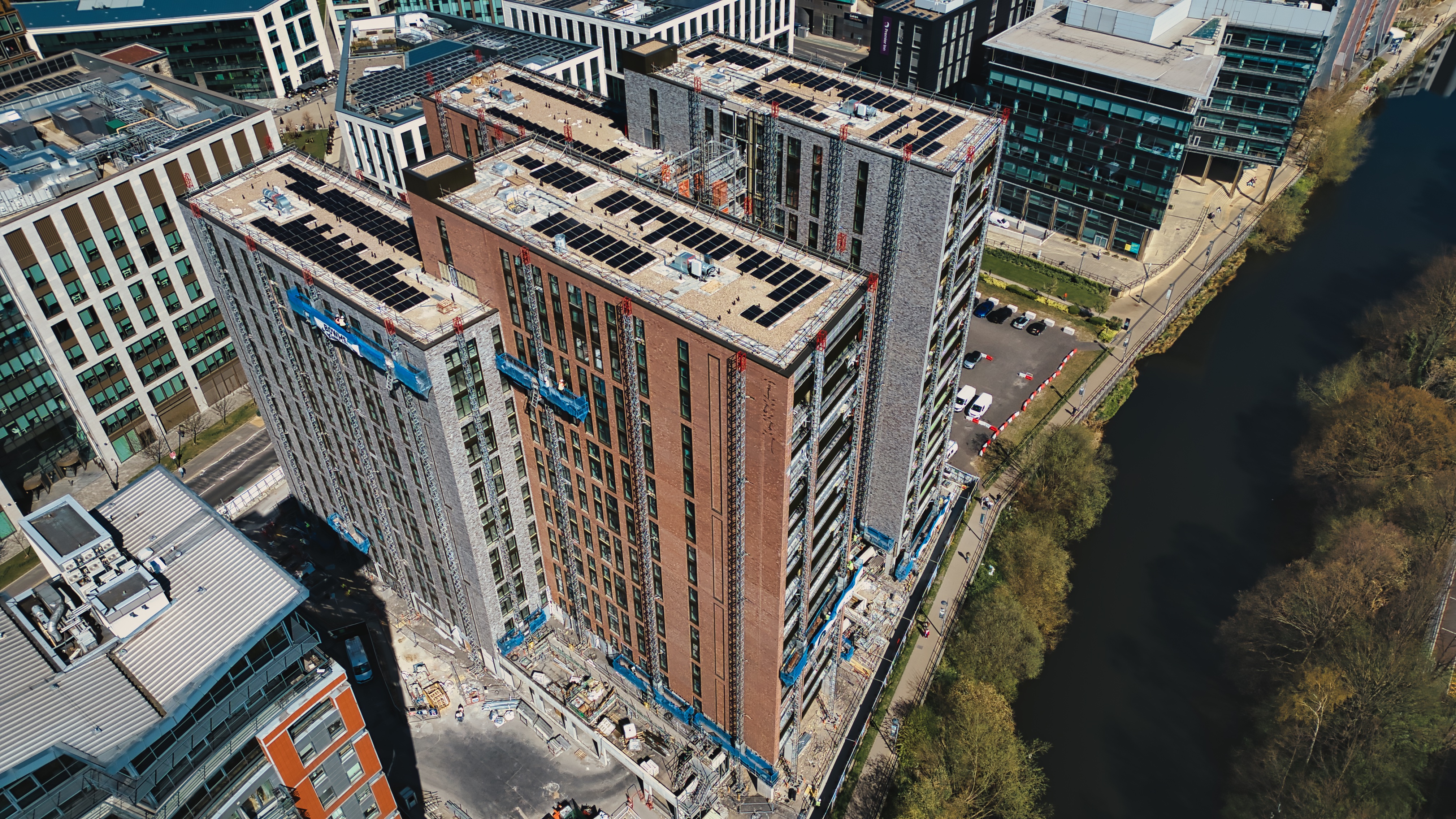 Aerial view of three tall buildings with solar panels on rooftops, partially under construction, beside a river, among other buildings in Leeds, UK.