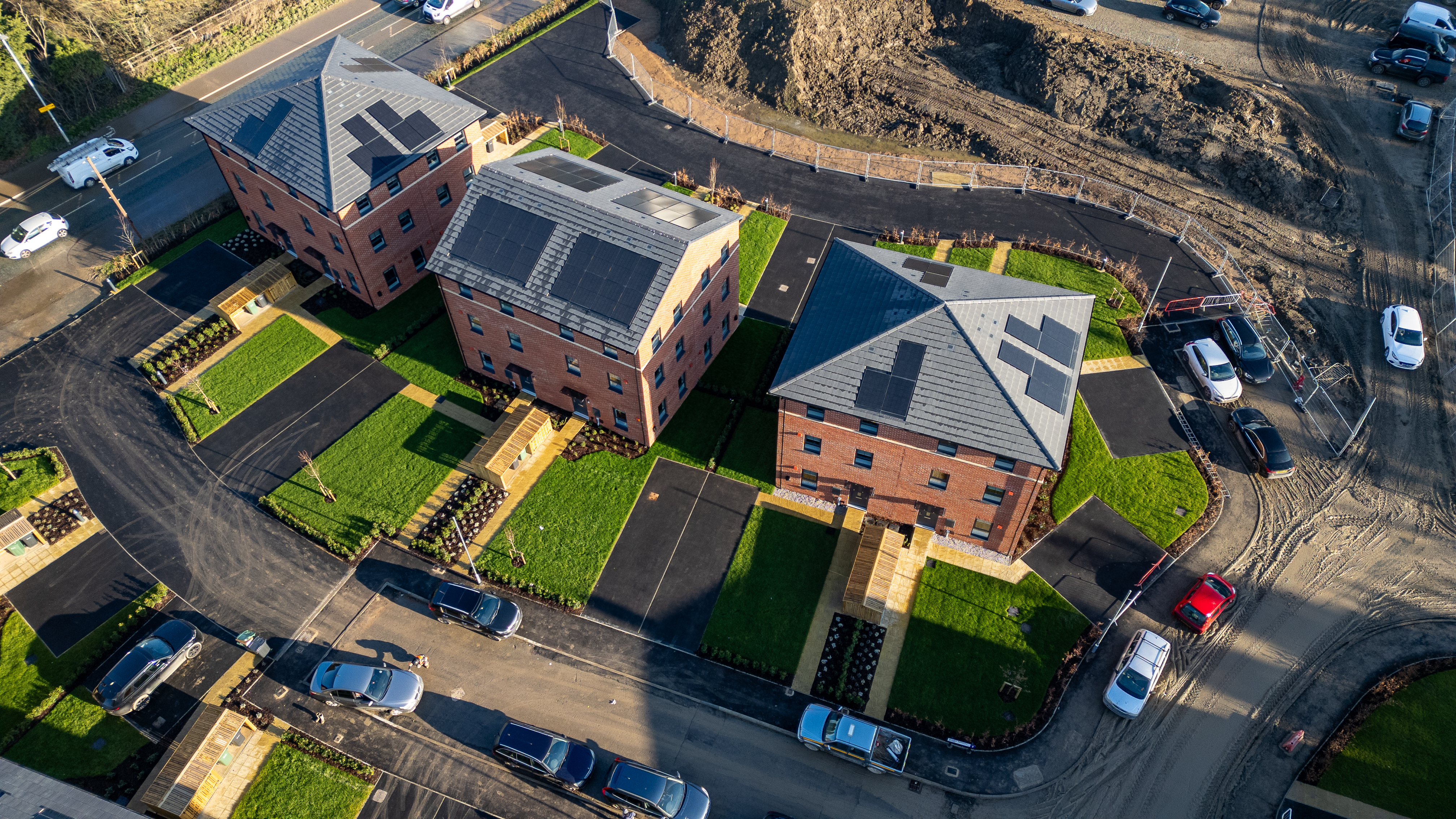 Aerial view of a new housing development with brick buildings, solar panels, manicured lawns, asphalt driveways, and parked cars at Desire by Strata Homes in Leeds, UK.