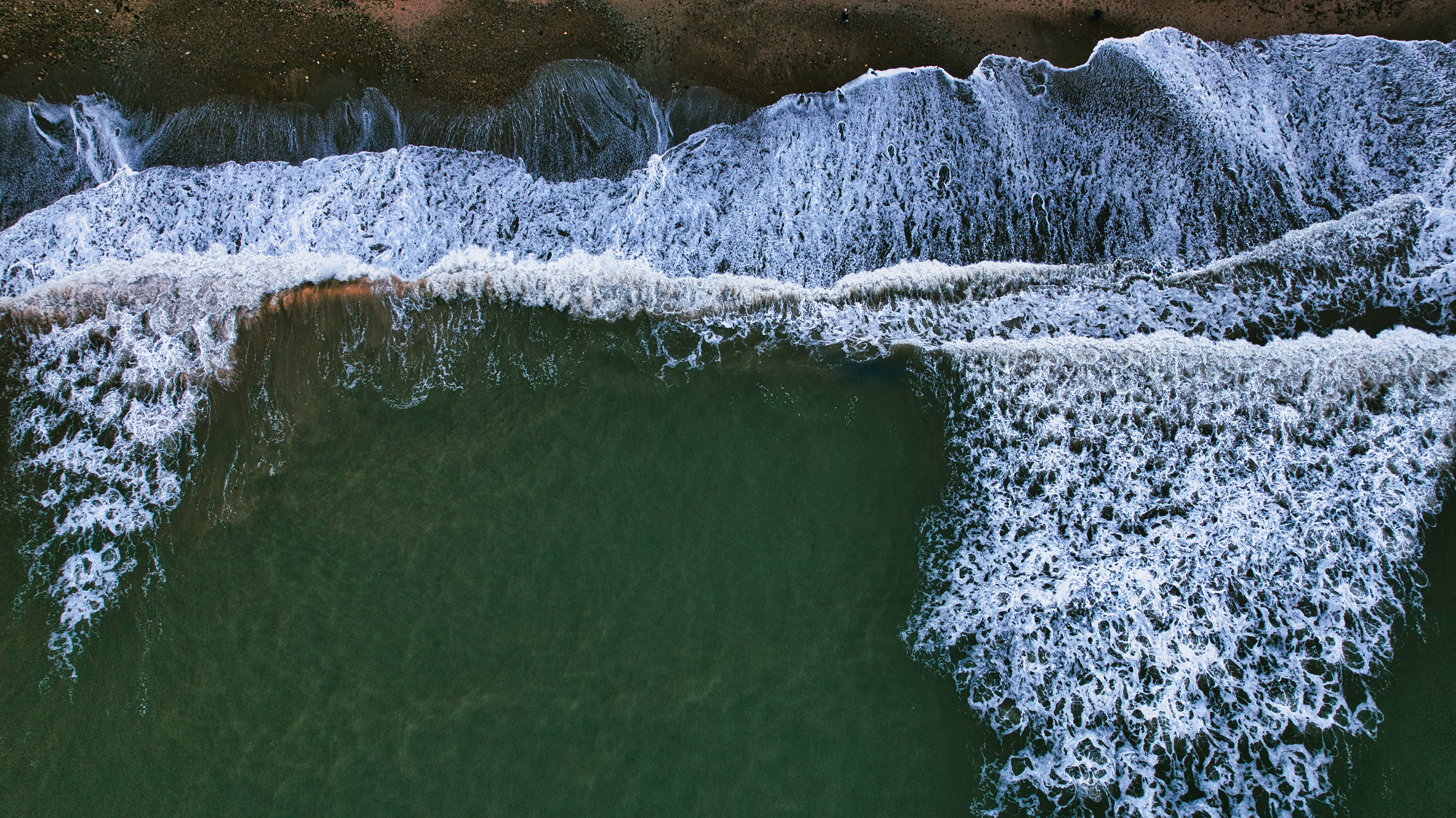 Aerial view of ocean waves breaking on a dark-colored beach. The water is a deep green, contrasting with the white foam of the waves. The image shows a clear line where the waves meet the shore.