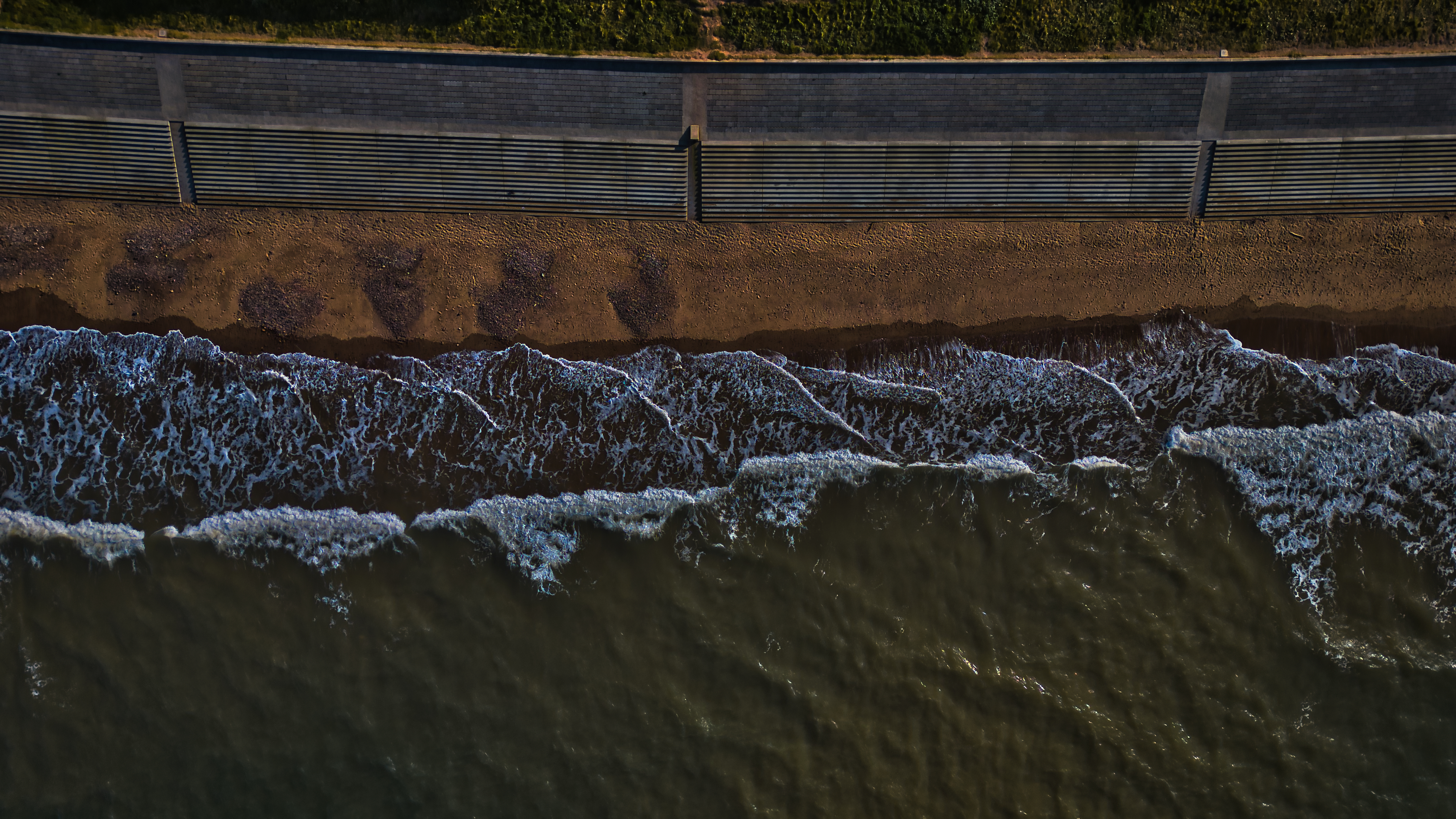 Aerial view of ocean waves crashing onto a sandy beach with a concrete seawall in the background.