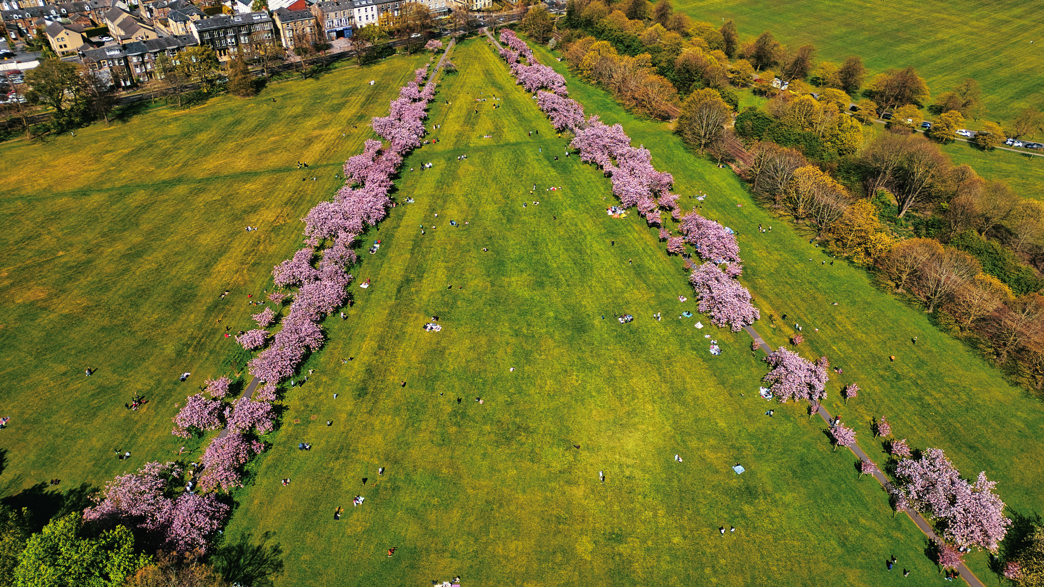 Aerial view of green park featuring rows of pink cherry blossom trees and scattered people relaxing. Buildings line the upper left in Harrogate, UK.