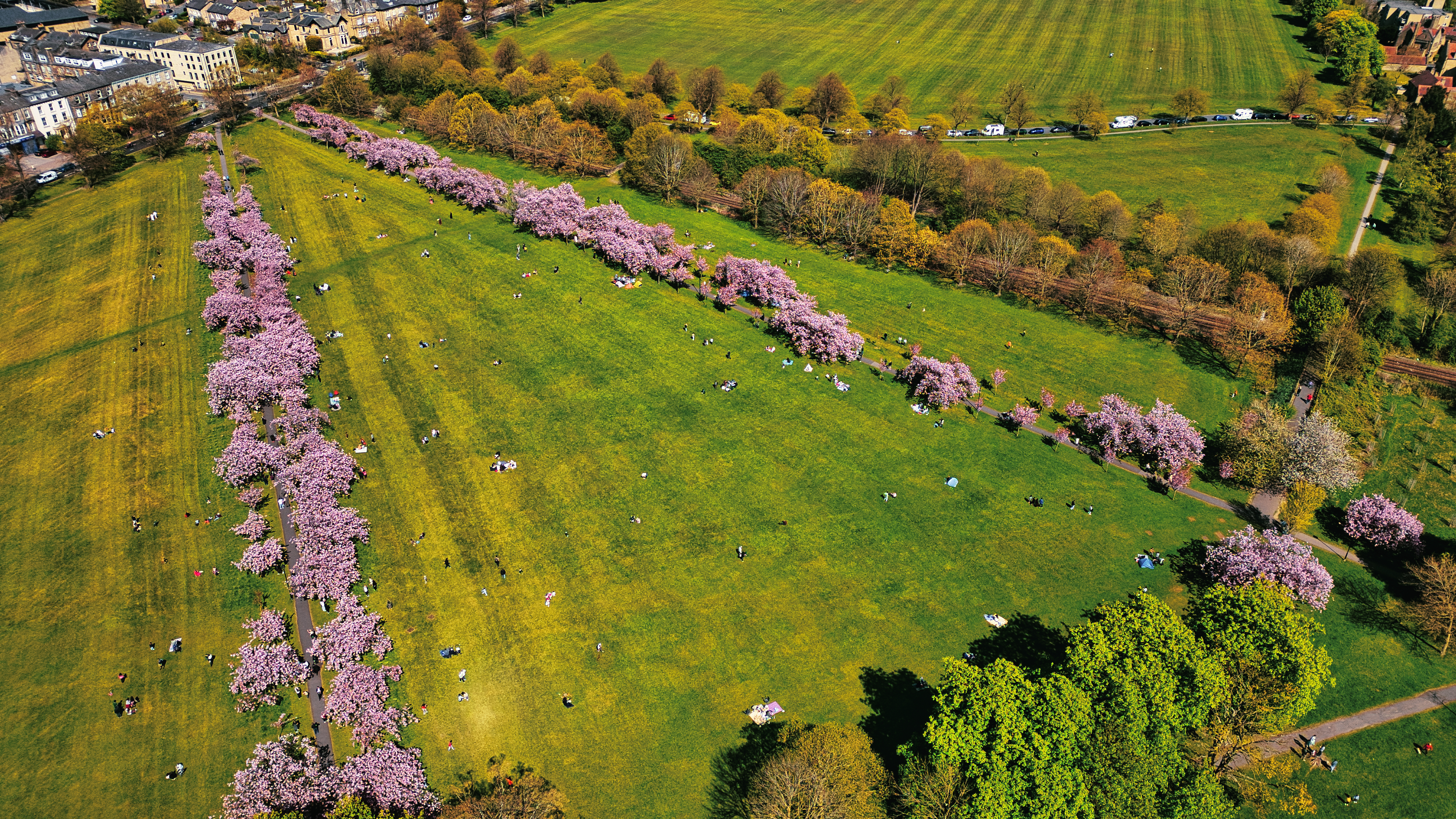 Aerial view of a park with flowering trees, people relaxing on the grass, and surrounding buildings and fields in Harrogate, UK.