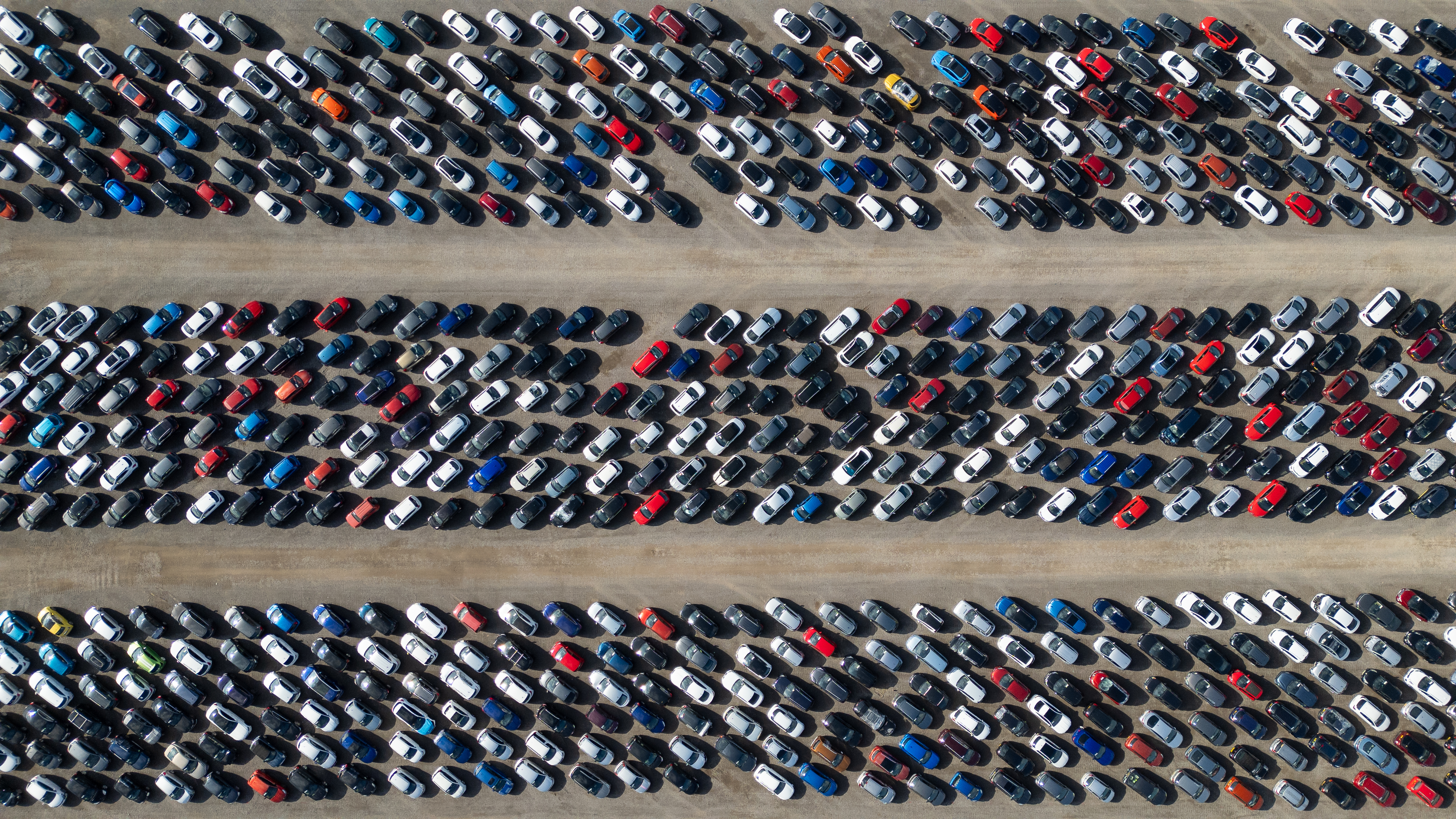An aerial view shows rows of parked cars in a lot. The cars are varied in color and are neatly arranged in horizontal lines at Copart yard, York, UK.