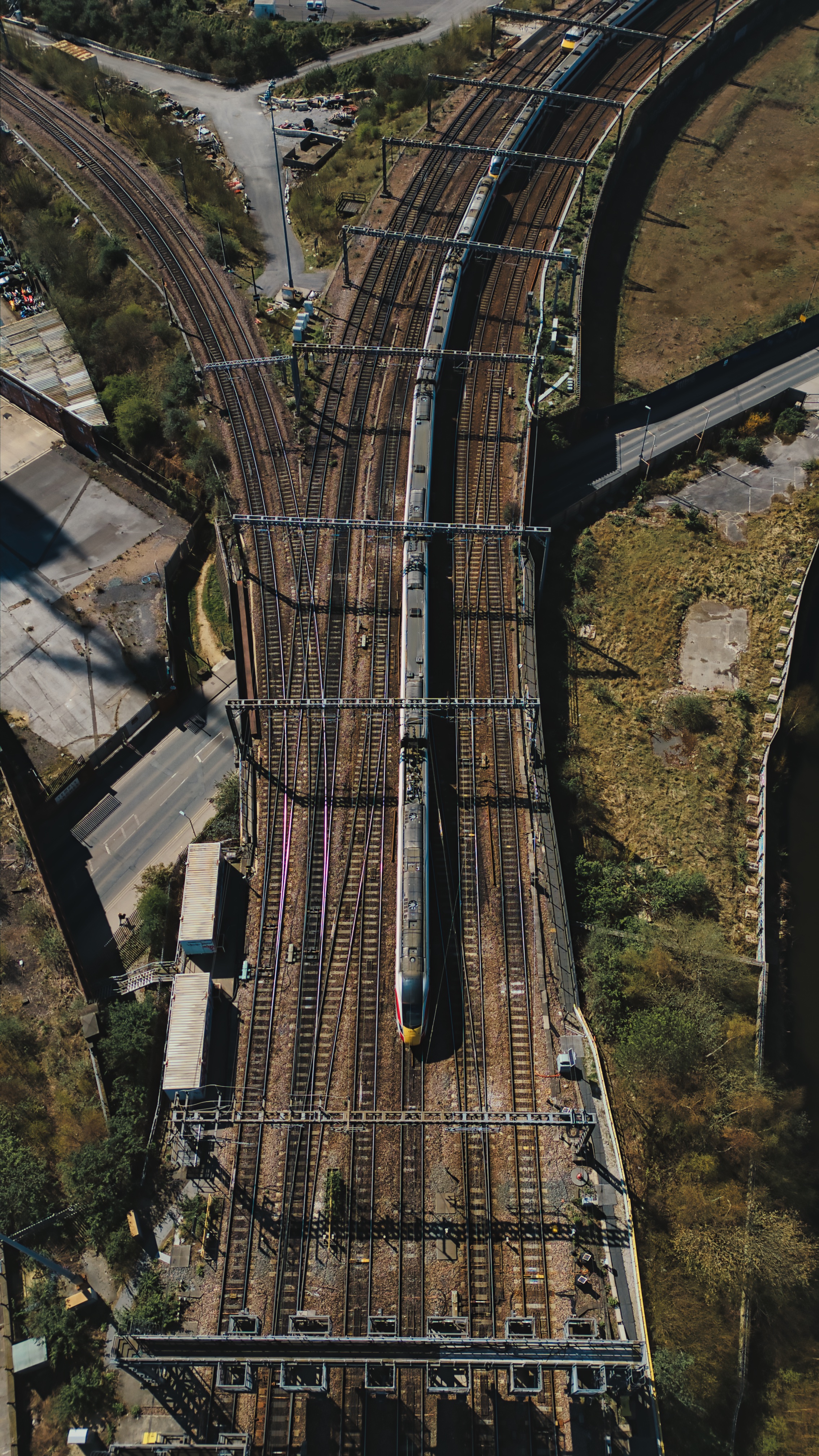 Aerial view of train tracks with a white train traveling along the rails. Green vegetation and concrete surround the train infrastructure in Leeds, UK.