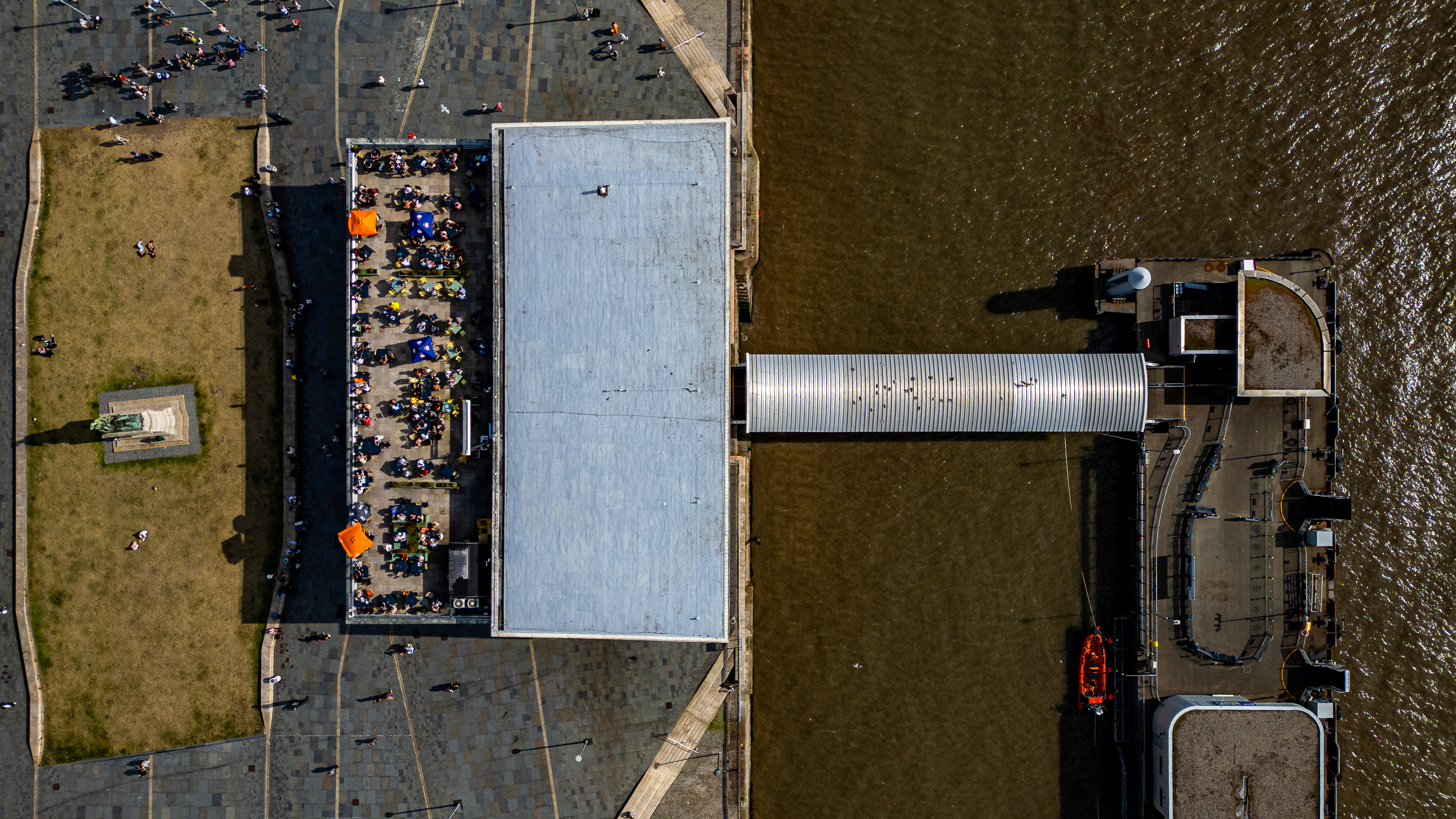 An aerial view shows a pier extending over muddy water, with a covered walkway connecting a building to a boat dock. People gather on grass and paved areas in Liverpool, UK.