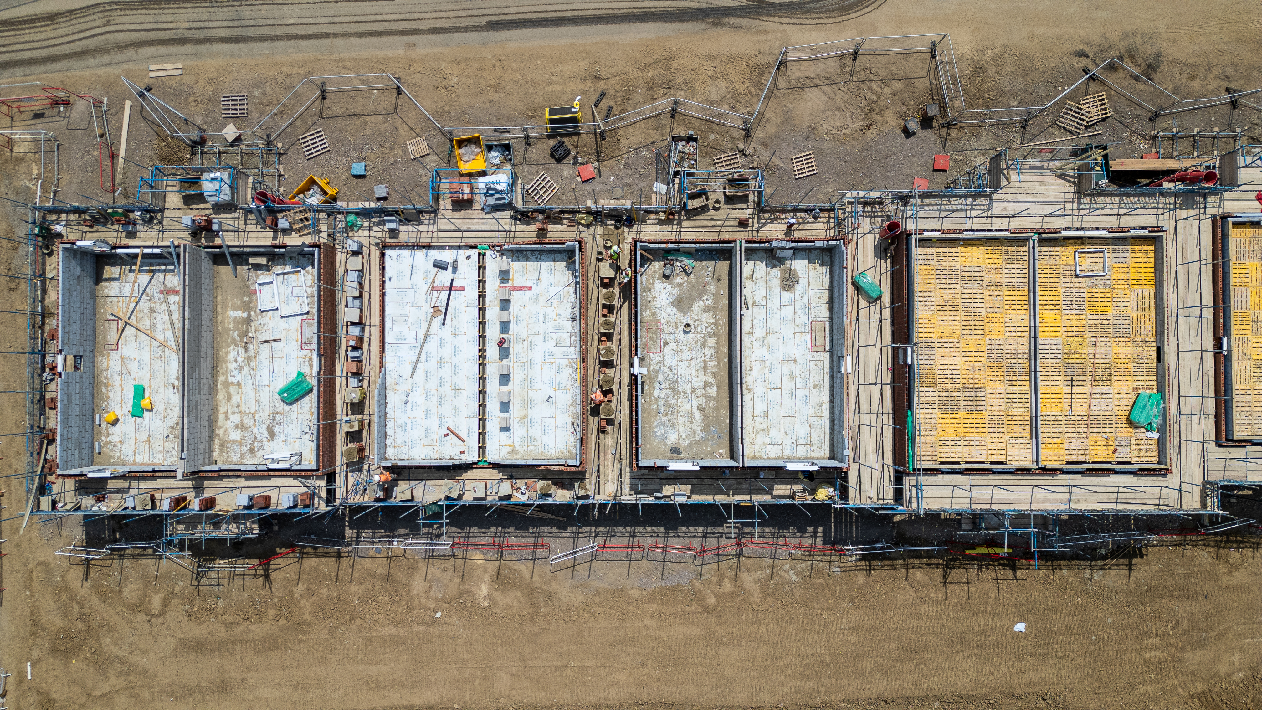 Aerial view of a construction site featuring a linear arrangement of rectangular foundations, some with scaffolding and materials at Miller Homes in Catterick, UK.