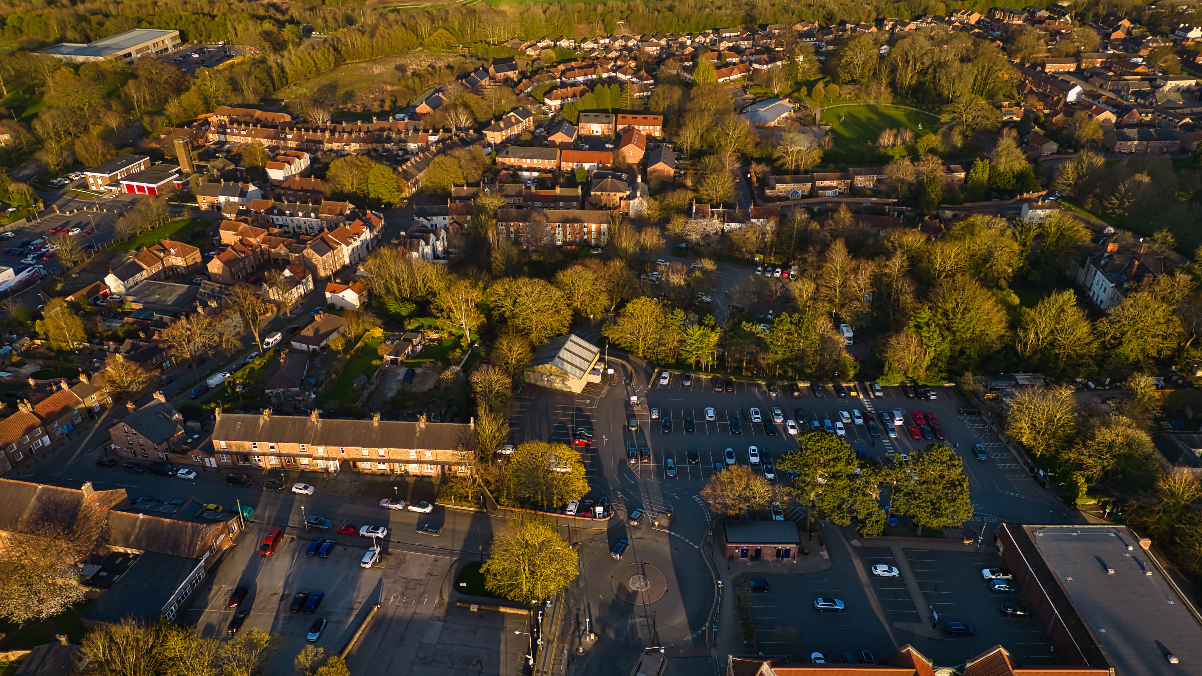 Aerial view of a small town featuring houses, trees, parking lots and streets with cars. Golden hour lighting in Ripon, UK.