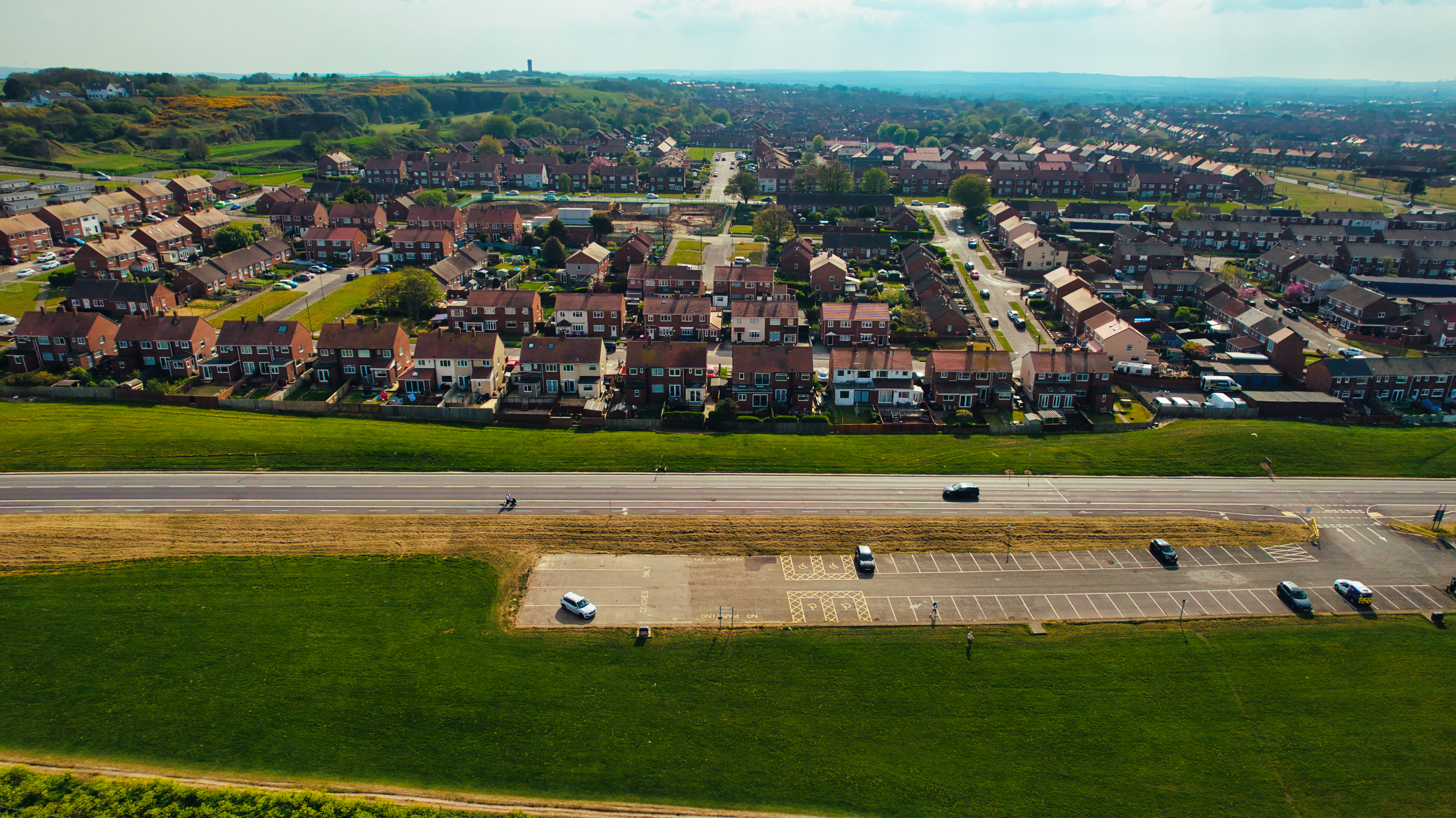 Aerial view of a suburban neighborhood with a road, parking lot, and green spaces in the foreground at Marsden Beach, UK.