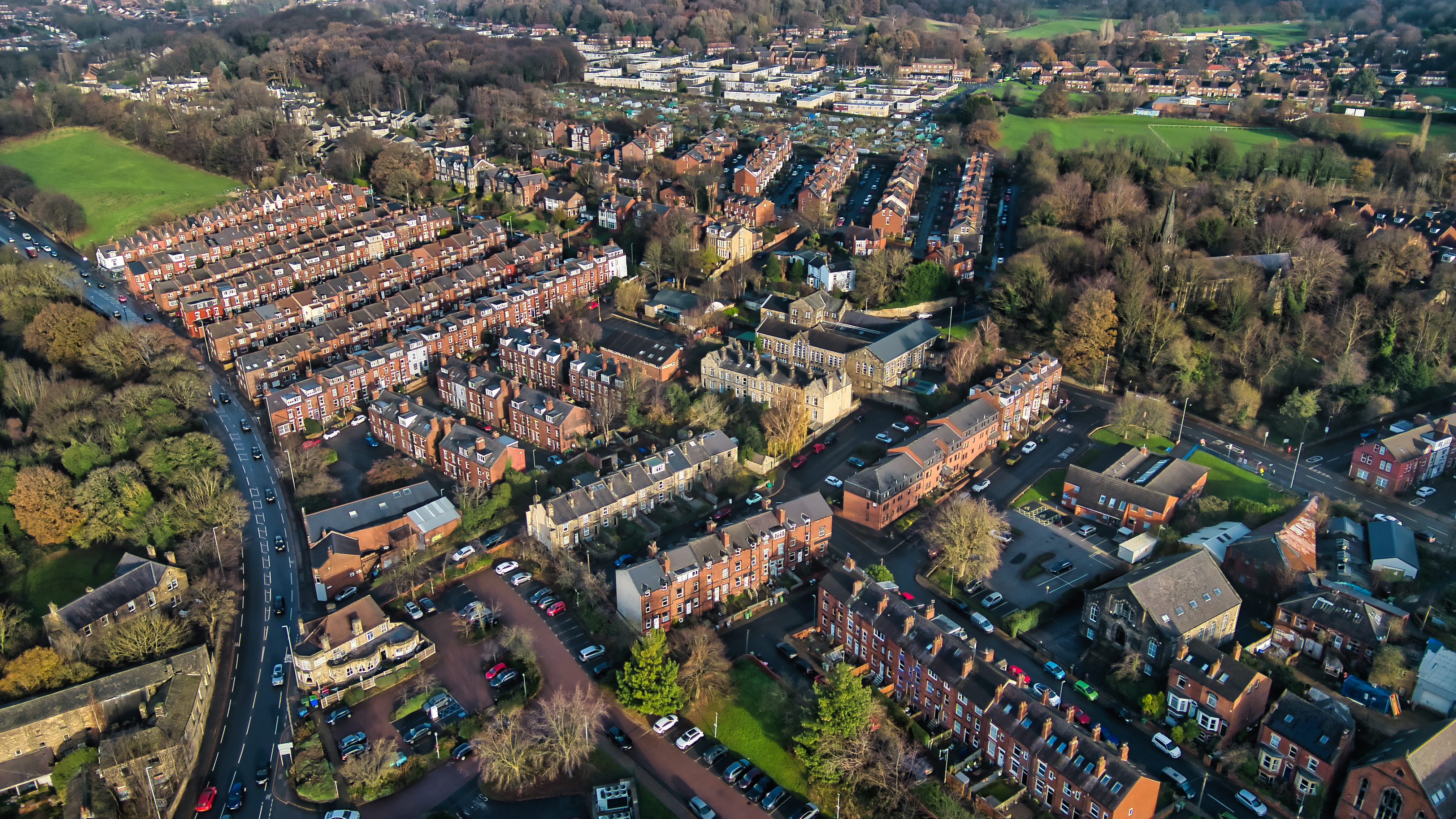 Aerial view of a residential neighborhood with rows of terraced houses, interspersed with greenery, roads, and a larger building that could be a school or community center. Predominantly brick buildings in varying shades of red and brown.