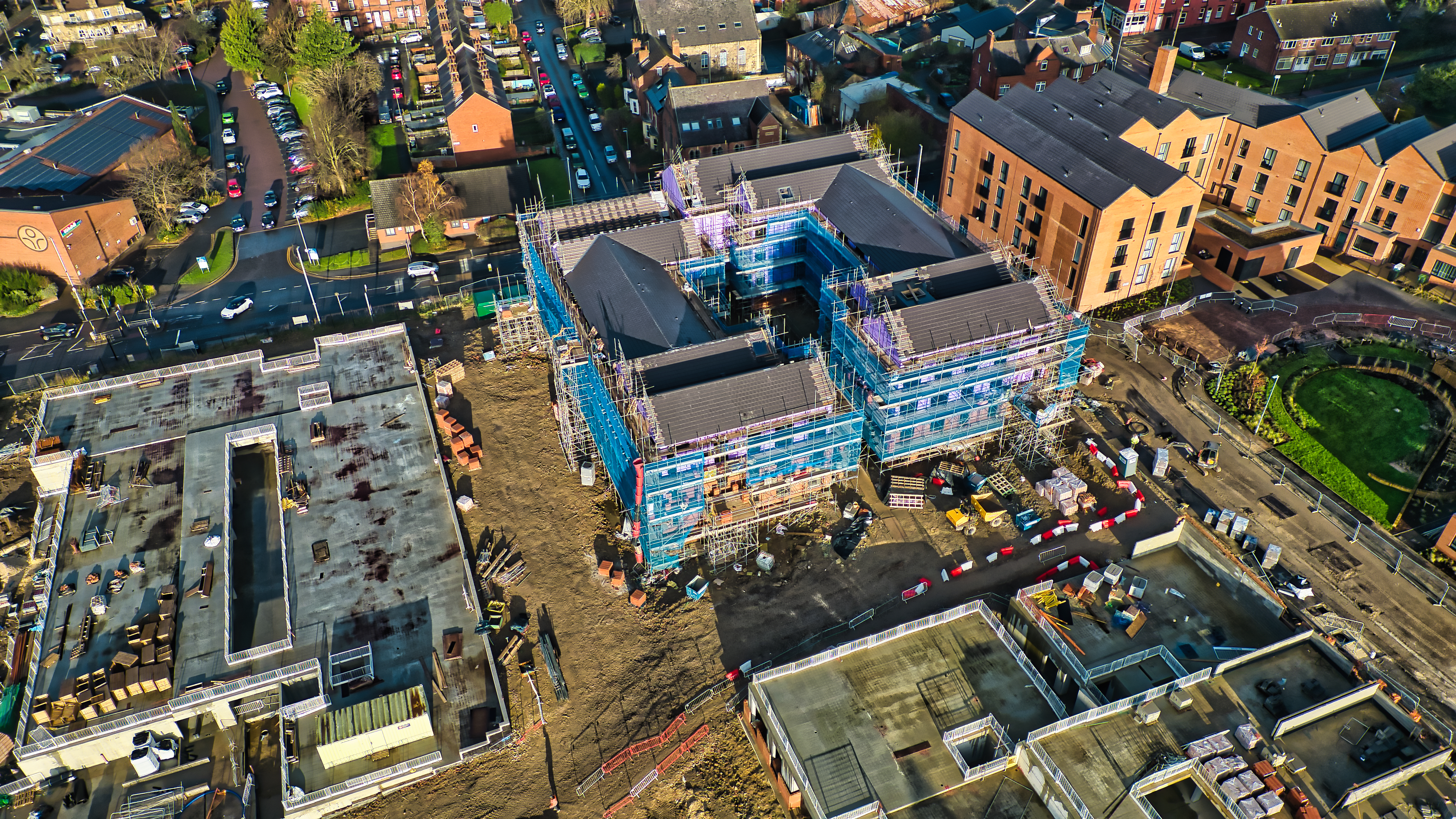 Aerial view of a residential construction site. A multi-building complex is under construction, surrounded by other buildings and roads. Scaffolding is visible, along with various construction materials and equipment.