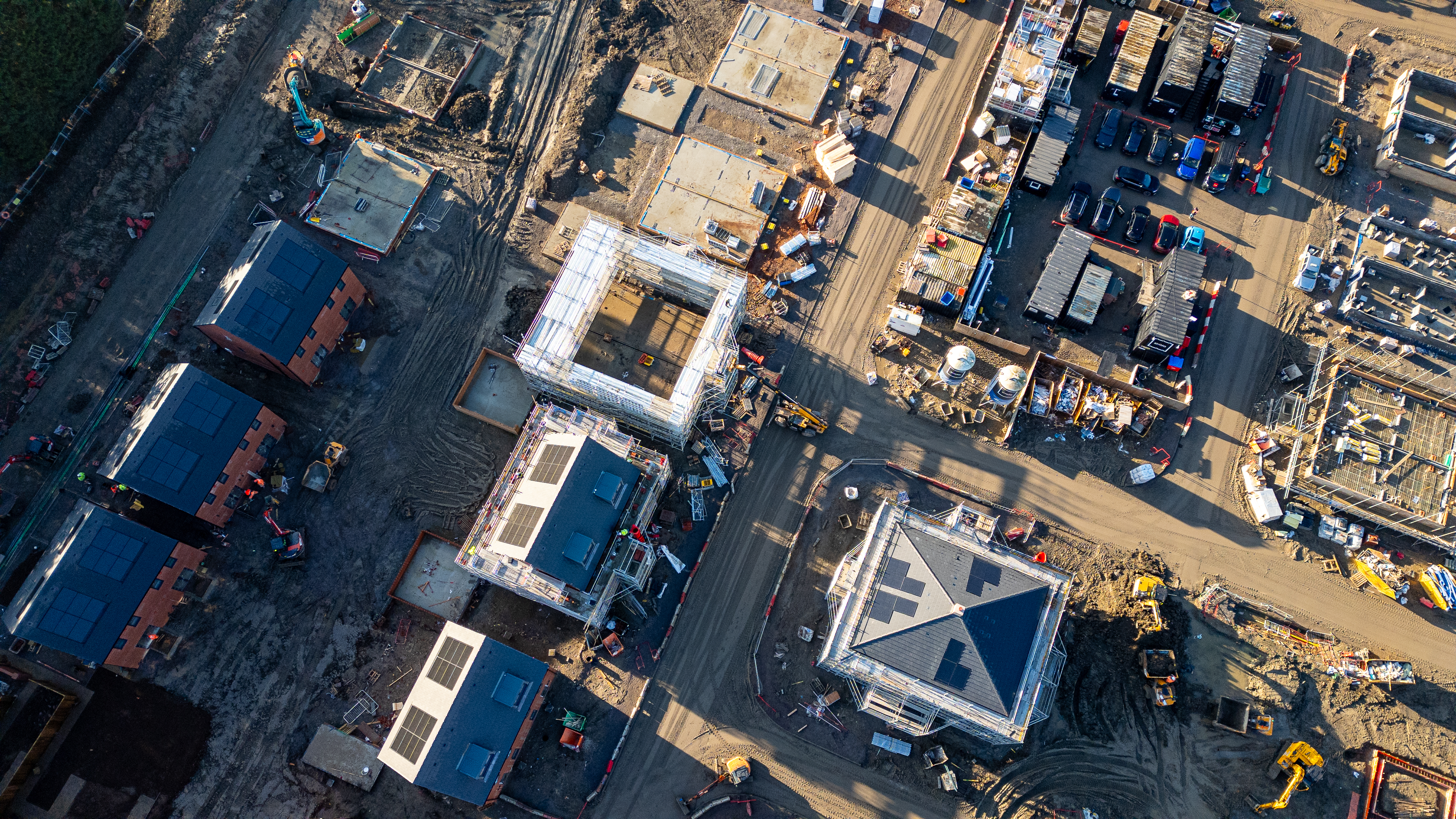 Aerial view of a construction site with partially built houses, scaffolding, heavy machinery, and various building materials under construction at Desire by Strata Homes in Leeds, UK.