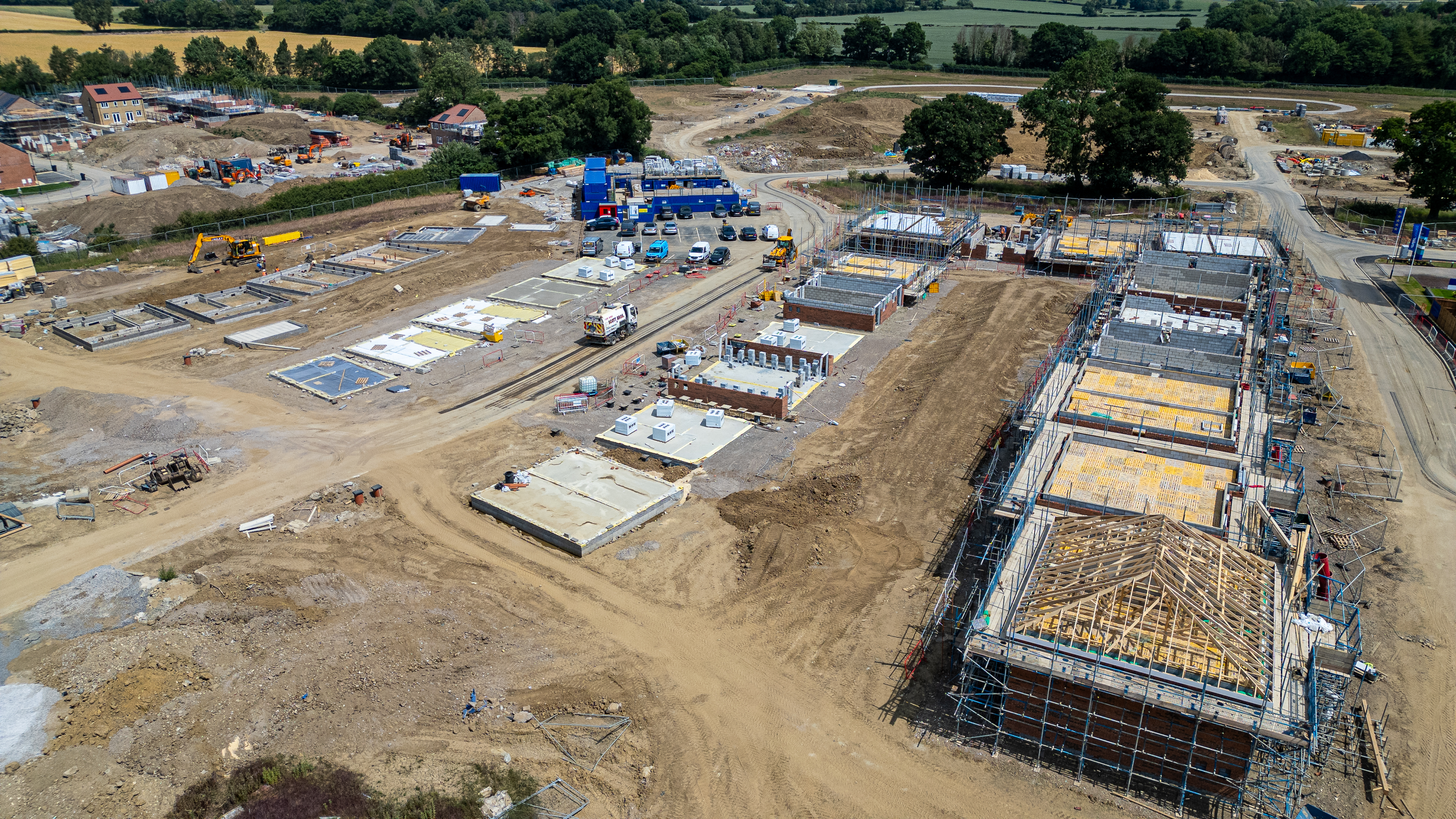 Aerial view of a residential construction site with various stages of building visible, including foundations, brickwork, and roof structures at Miller Homes in Catterick, UK.