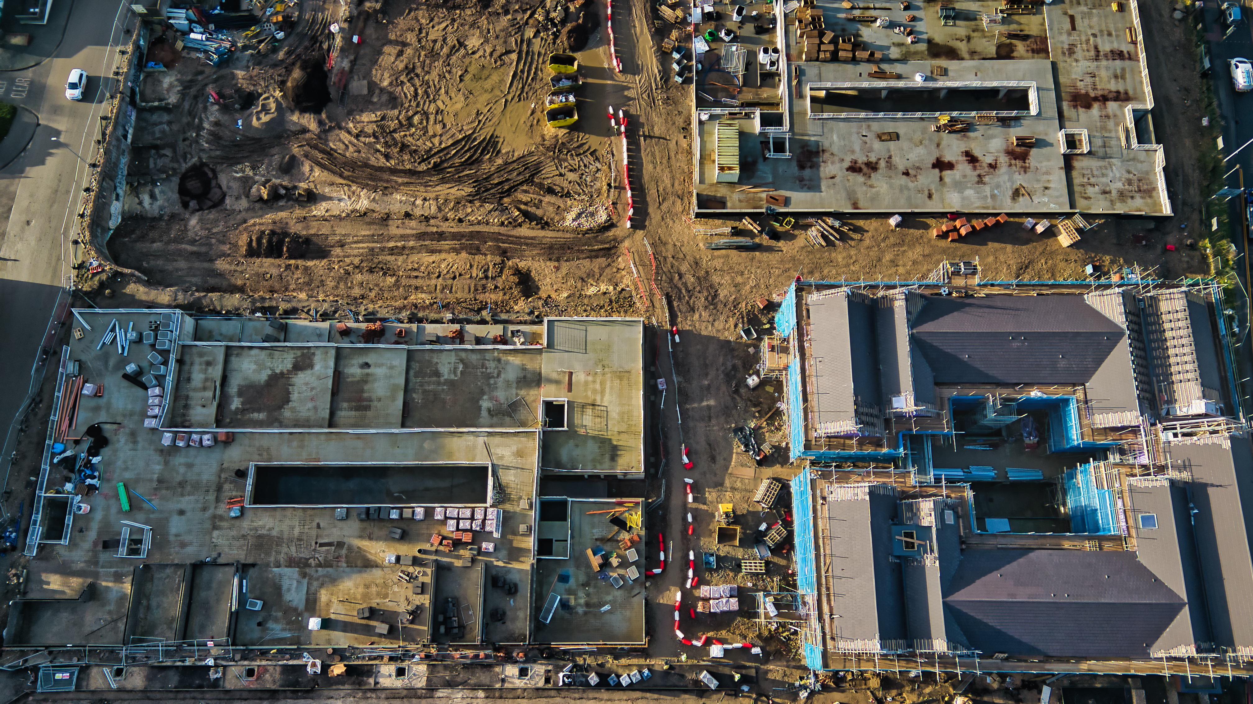 Aerial view of a construction site showing two buildings under construction, one with a concrete base and the other with a dark gray roof, surrounded by excavated earth and construction materials.
