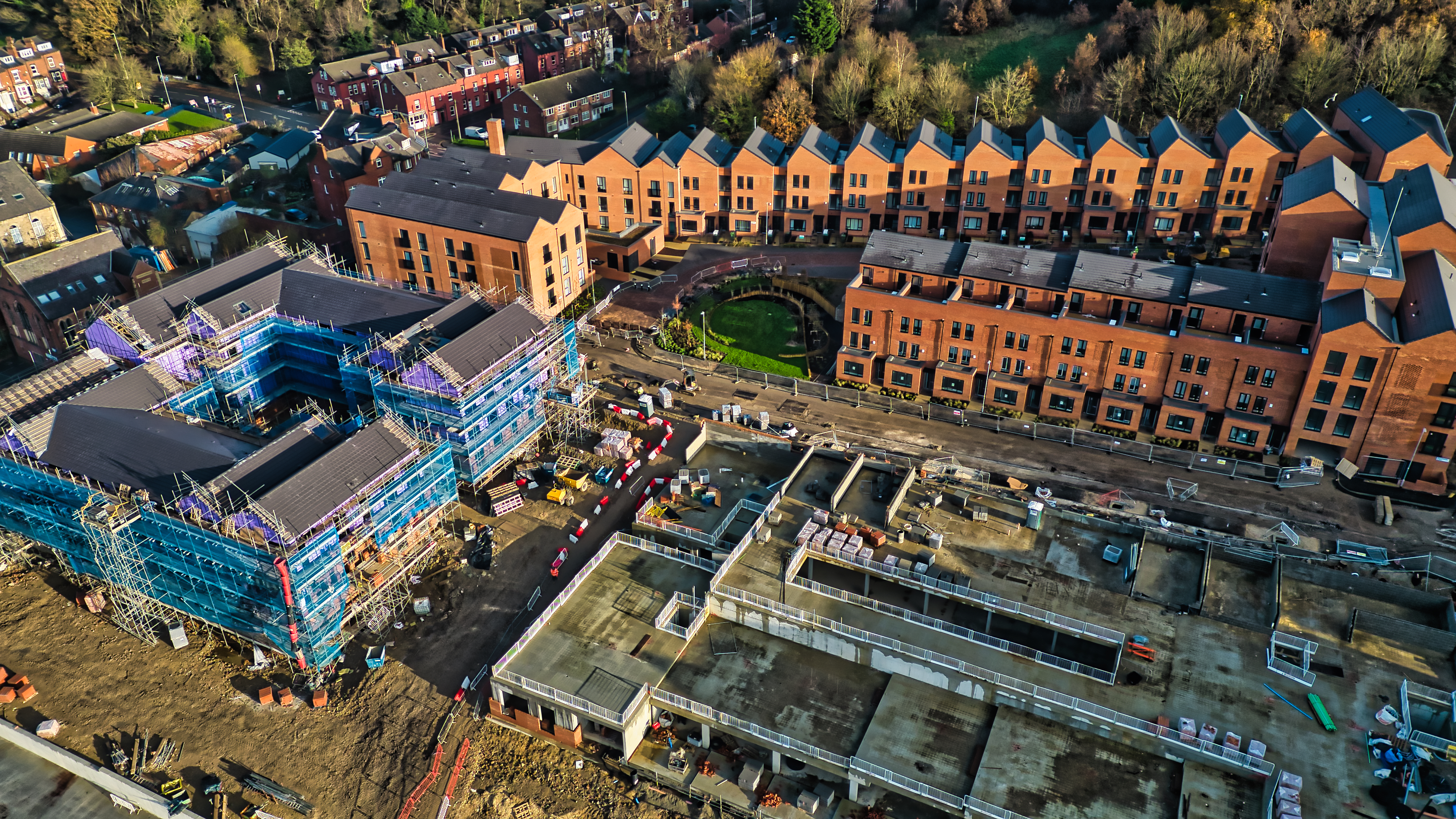 Aerial view of a residential construction site. Brick townhouses are complete, while adjacent buildings are under construction, surrounded by scaffolding and building materials. The scene shows a mix of finished and unfinished structures.