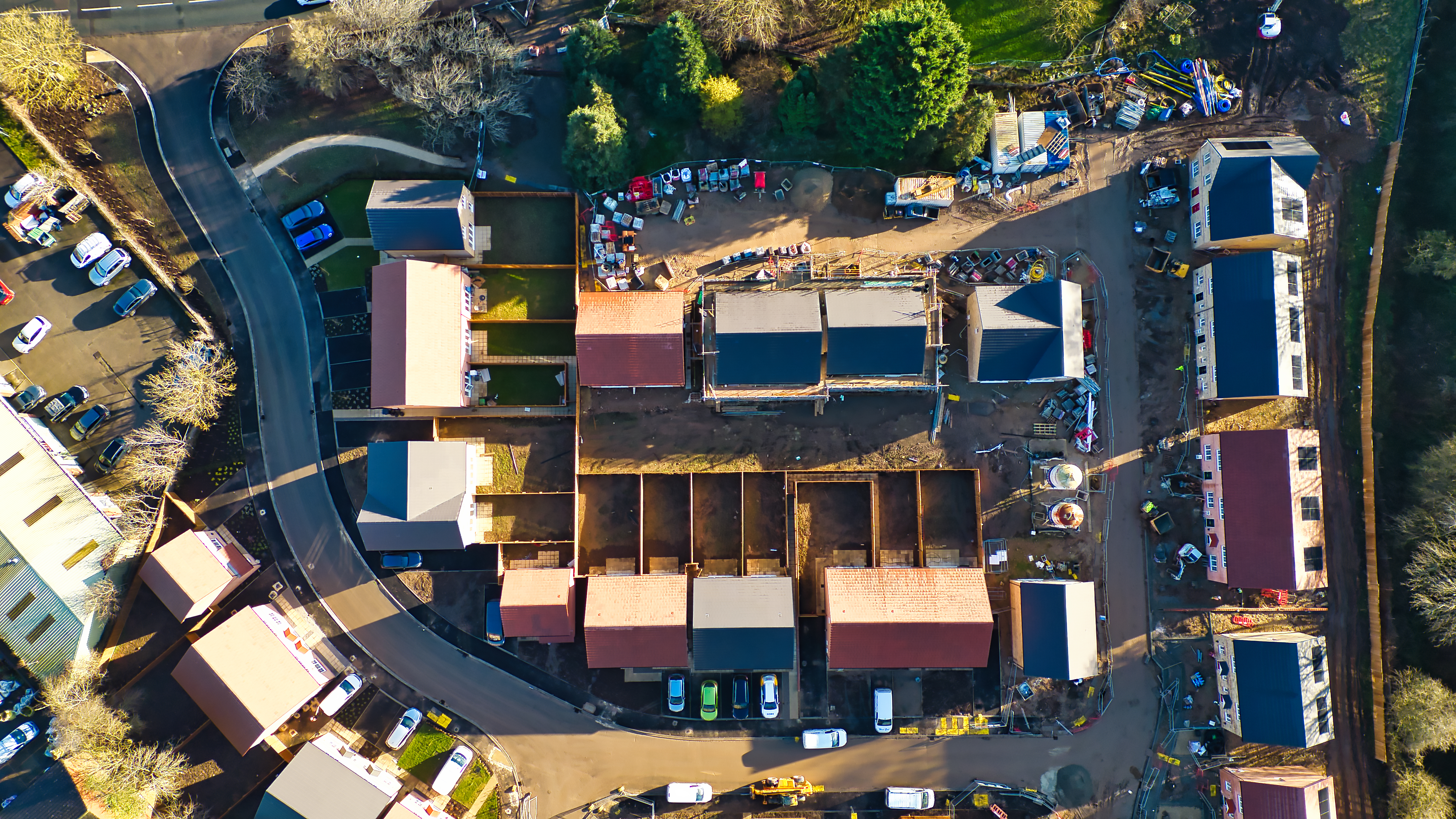 Aerial view of a residential development under construction. Houses in various stages of completion, surrounded by roads and landscaping in Knaresborough, UK.