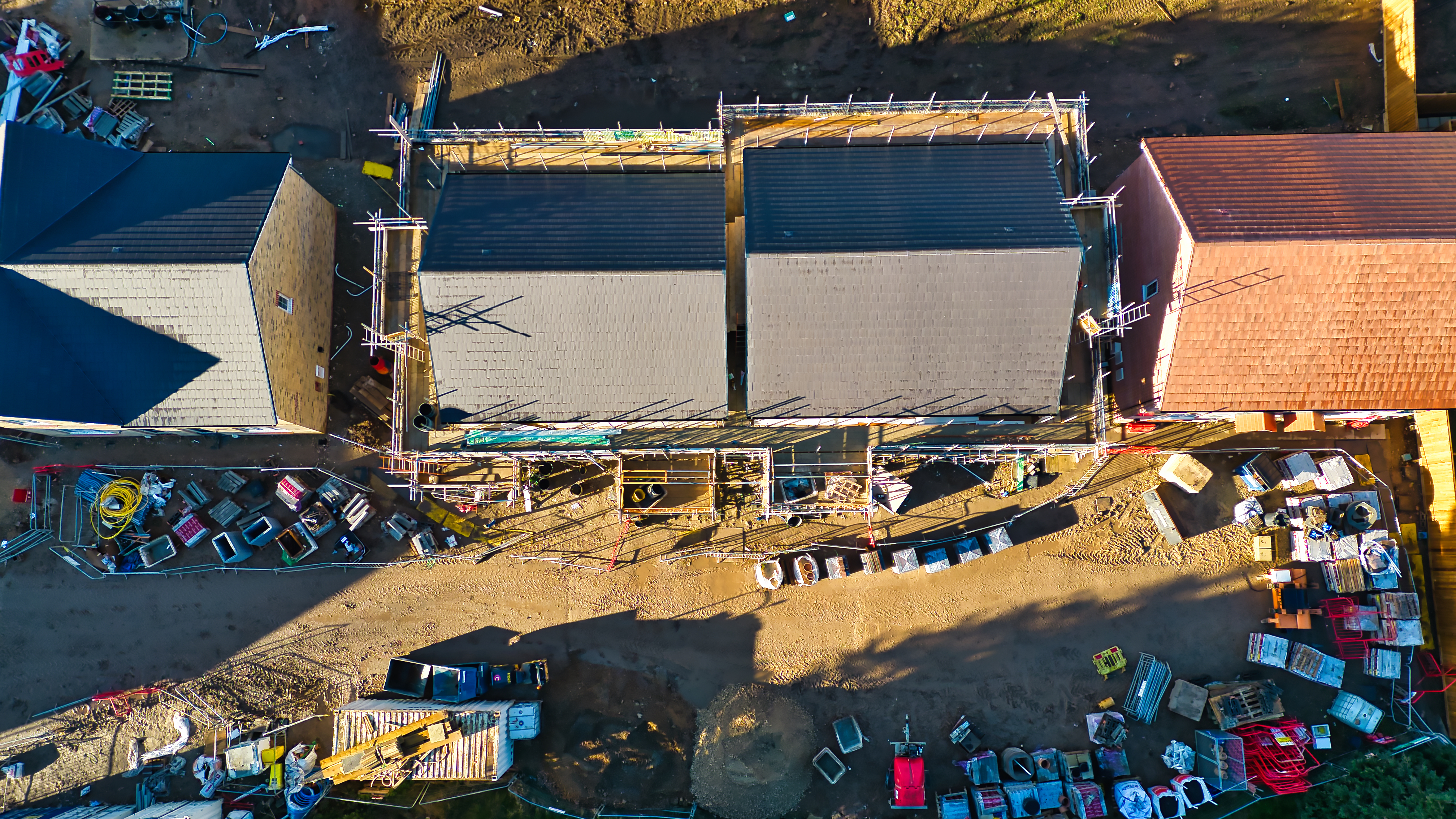 Aerial view of a residential construction site showing two new houses under construction with scaffolding, surrounded by building materials and partially completed neighboring houses in Knaresborough, UK.