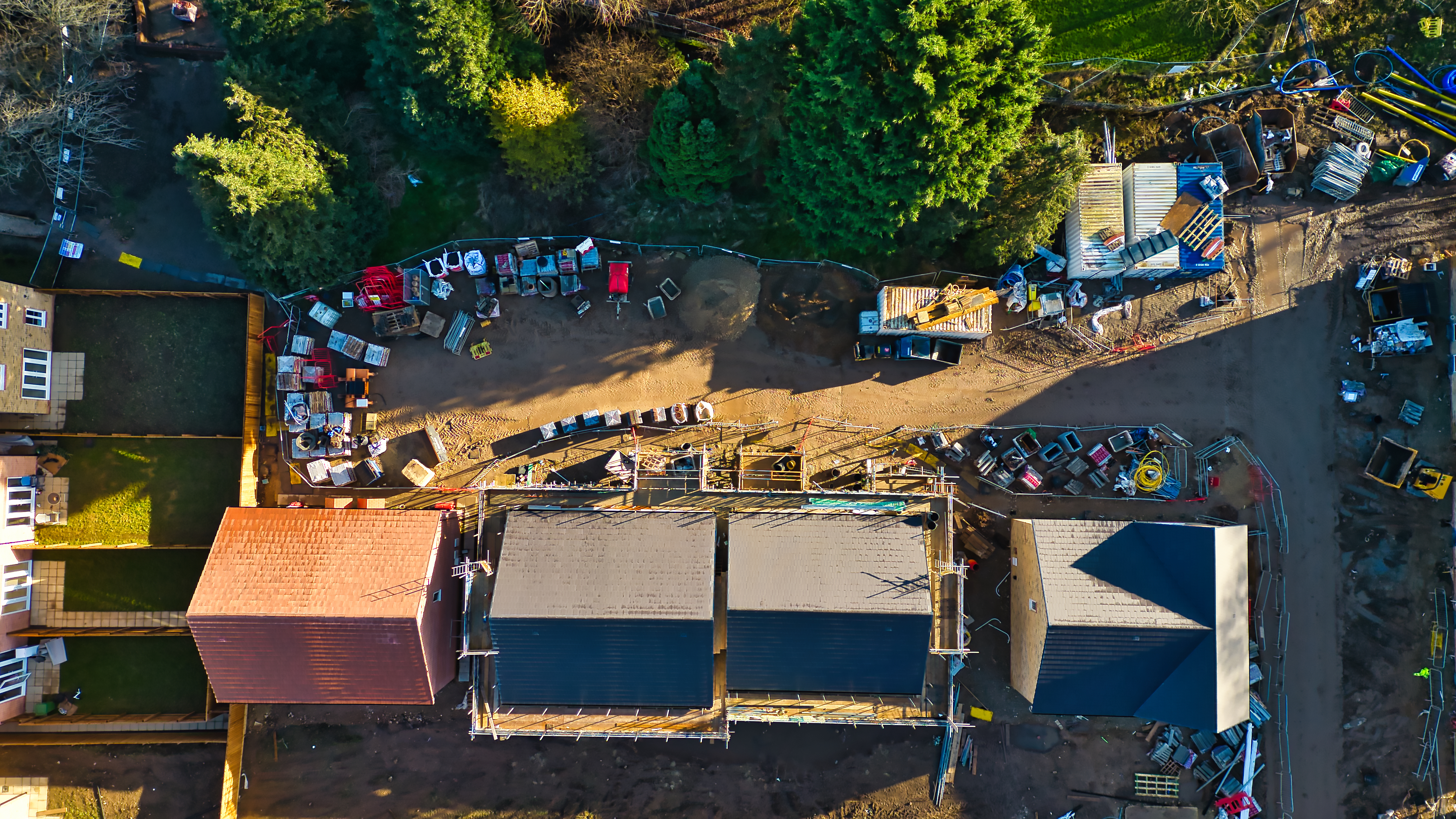 Aerial view of a residential construction site. Two new houses under construction are flanked by completed homes. Construction materials and equipment are scattered throughout the site in Knaresborough, UK.