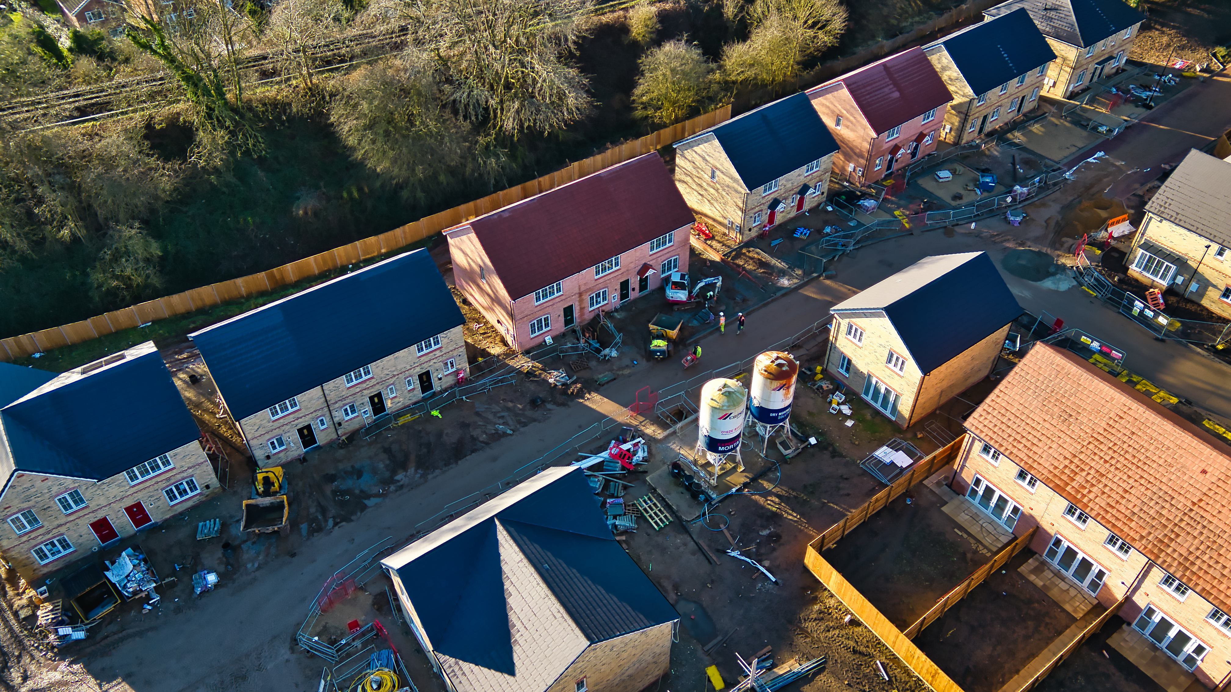 Aerial view of a new housing development under construction. Rows of partially completed houses, construction equipment, and workers are visible. The scene is dominated by earth tones and muted colors in Knaresborough, UK.