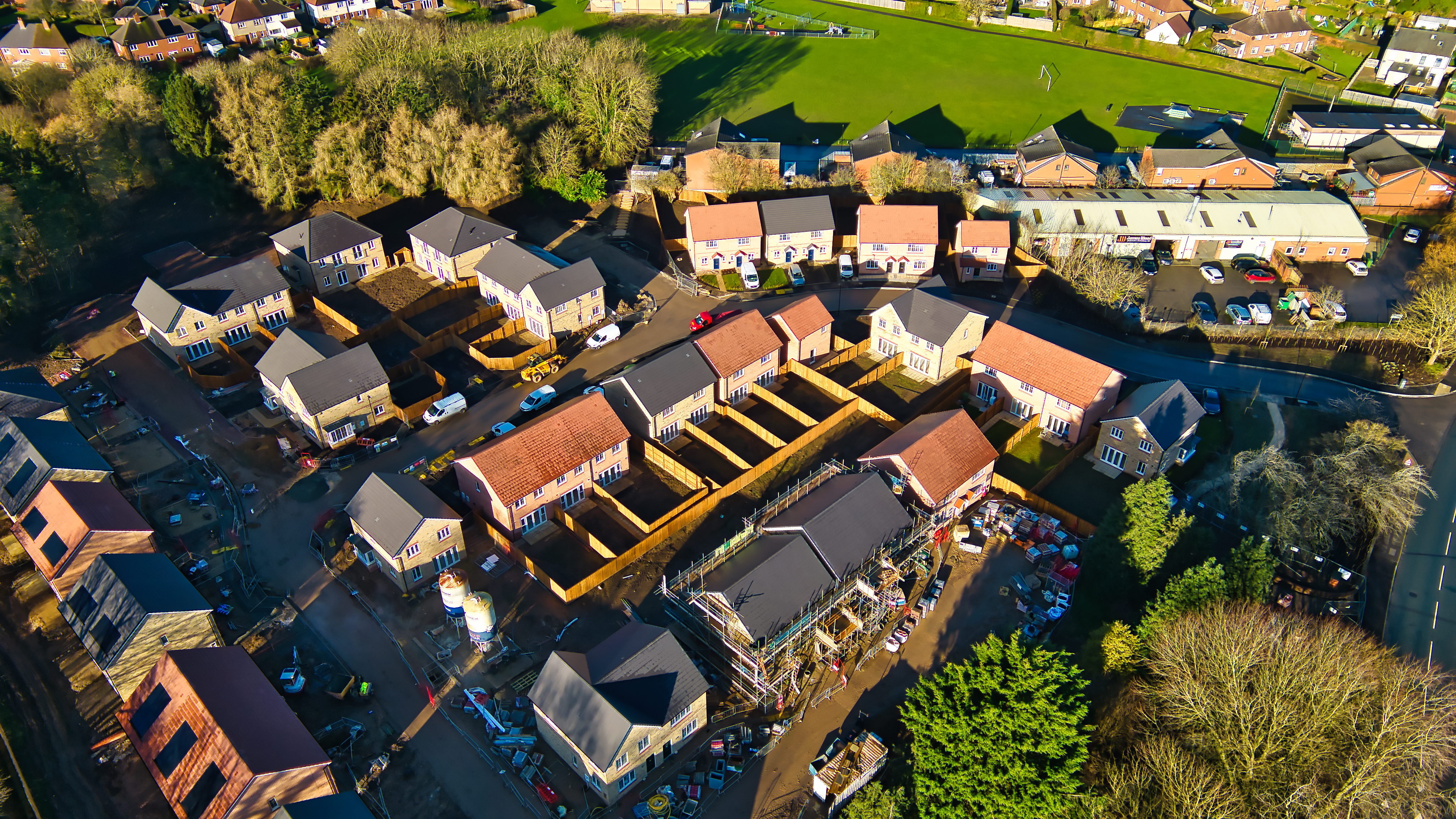 Aerial view of a new housing development, showcasing rows of two-story homes under construction, surrounded by mature trees and existing residential areas. Construction materials and vehicles are visible in Knaresborough, UK.